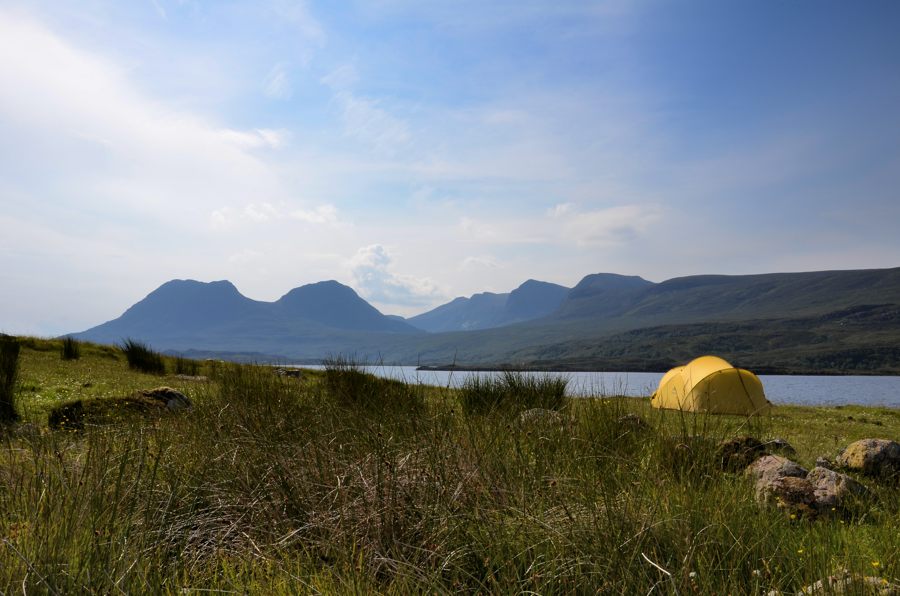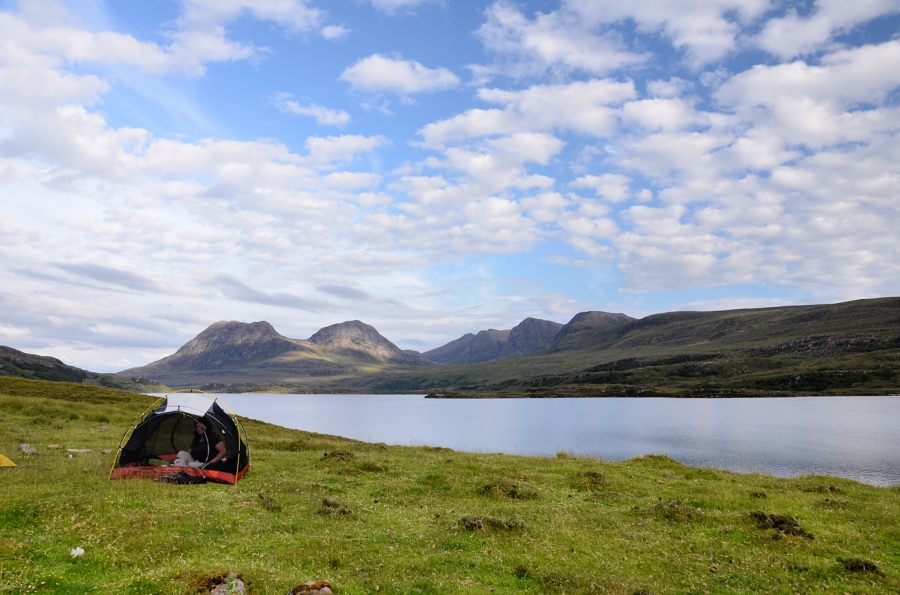 Camped beside Loch Bad a’Ghaill, Inverpolly. Keeping the flysheet off until the evening lets us enjoy the view without the midges.
