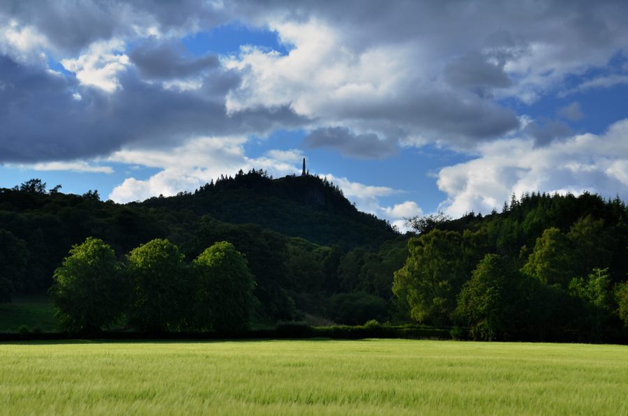 Looking North towards the granite obelisk on Dunmore hill which commemorates Henry Dundas, 1st Viscount Melville. Comrie, Scotland