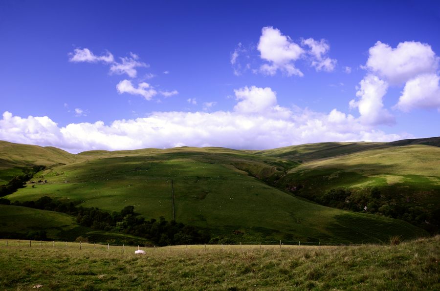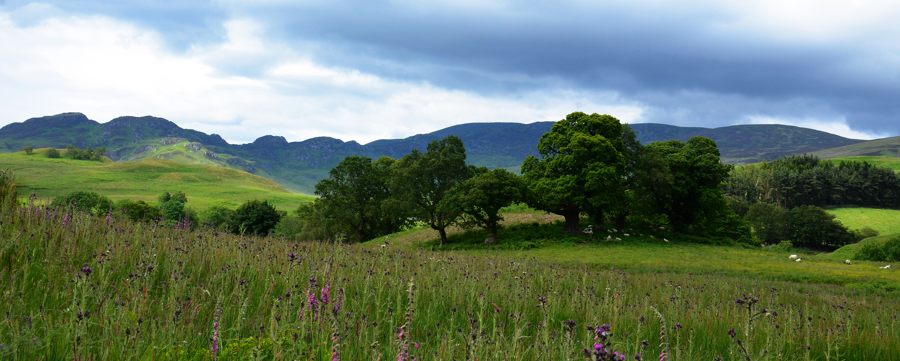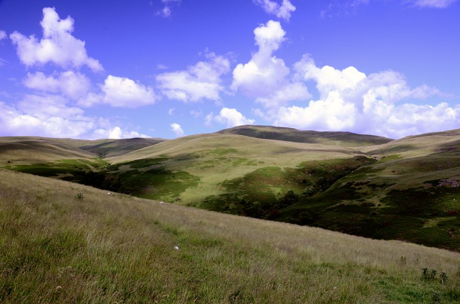 Pastures and derelict buildings on the hills to the North East of Dumyat