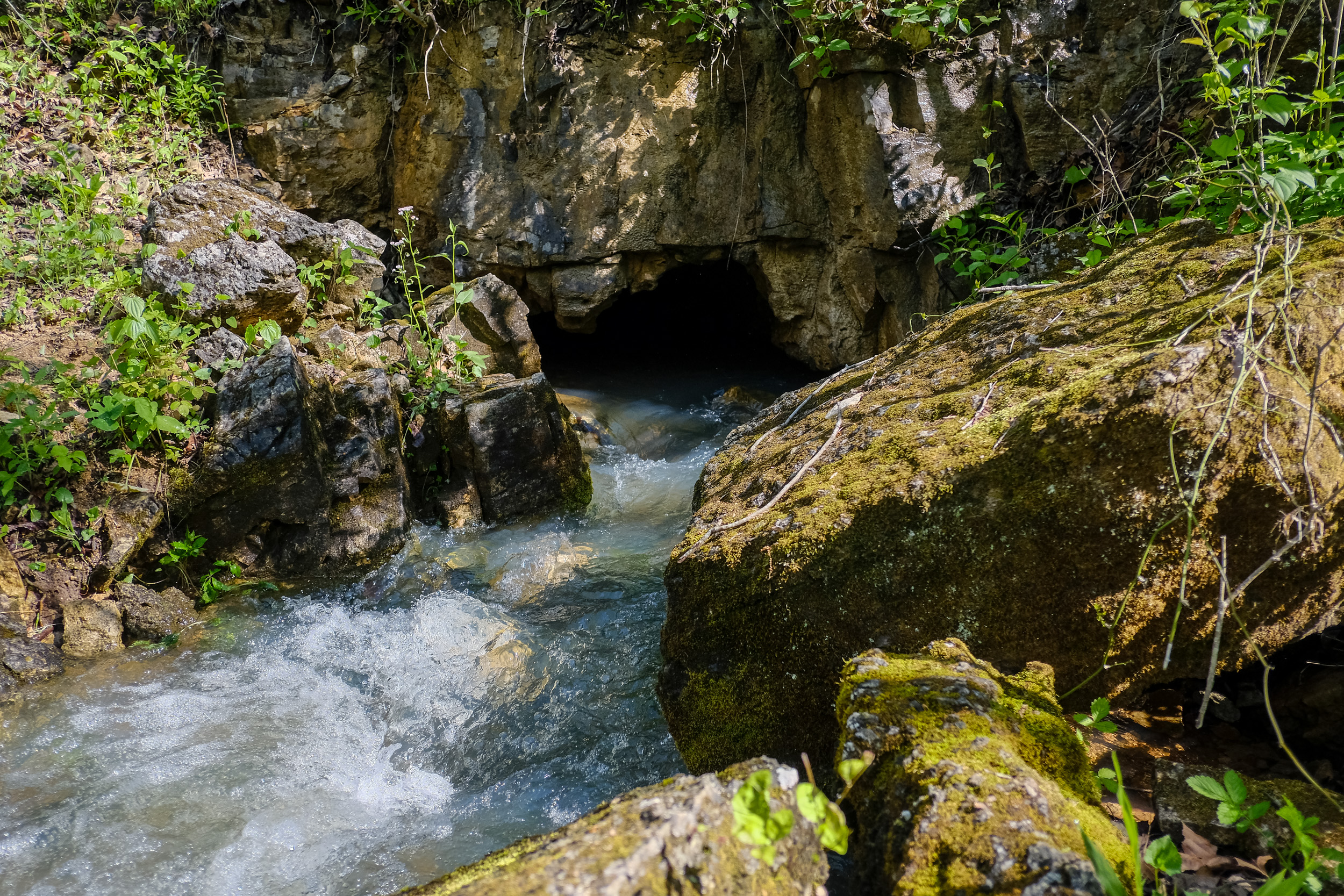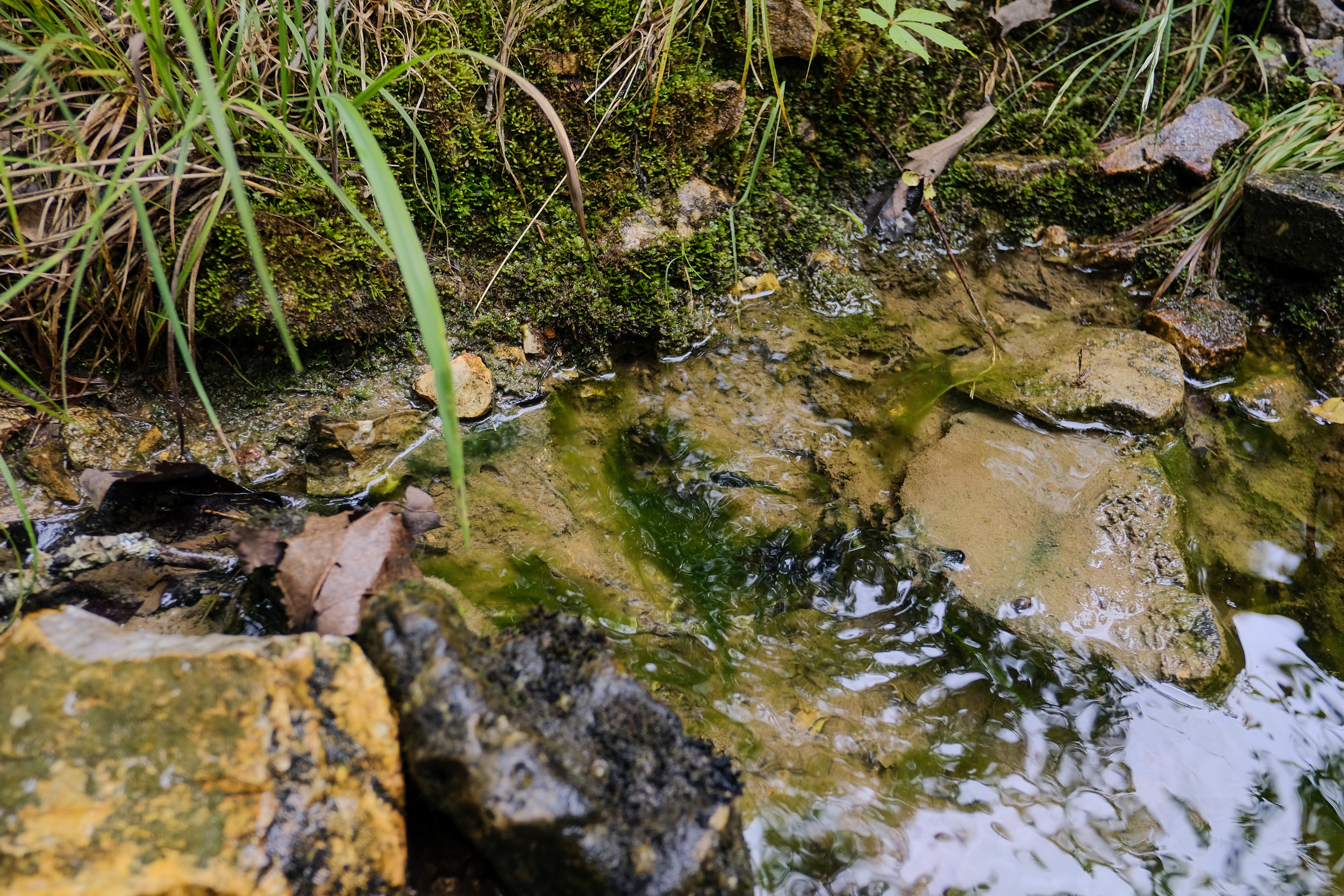 Spring – The water was rushing out of a tiny 1″-1.5″ hole (center frame where the weed is collecting). It was putting out several gallons per minute. Copyright © 2021 Gary Allman, all rights reserved.