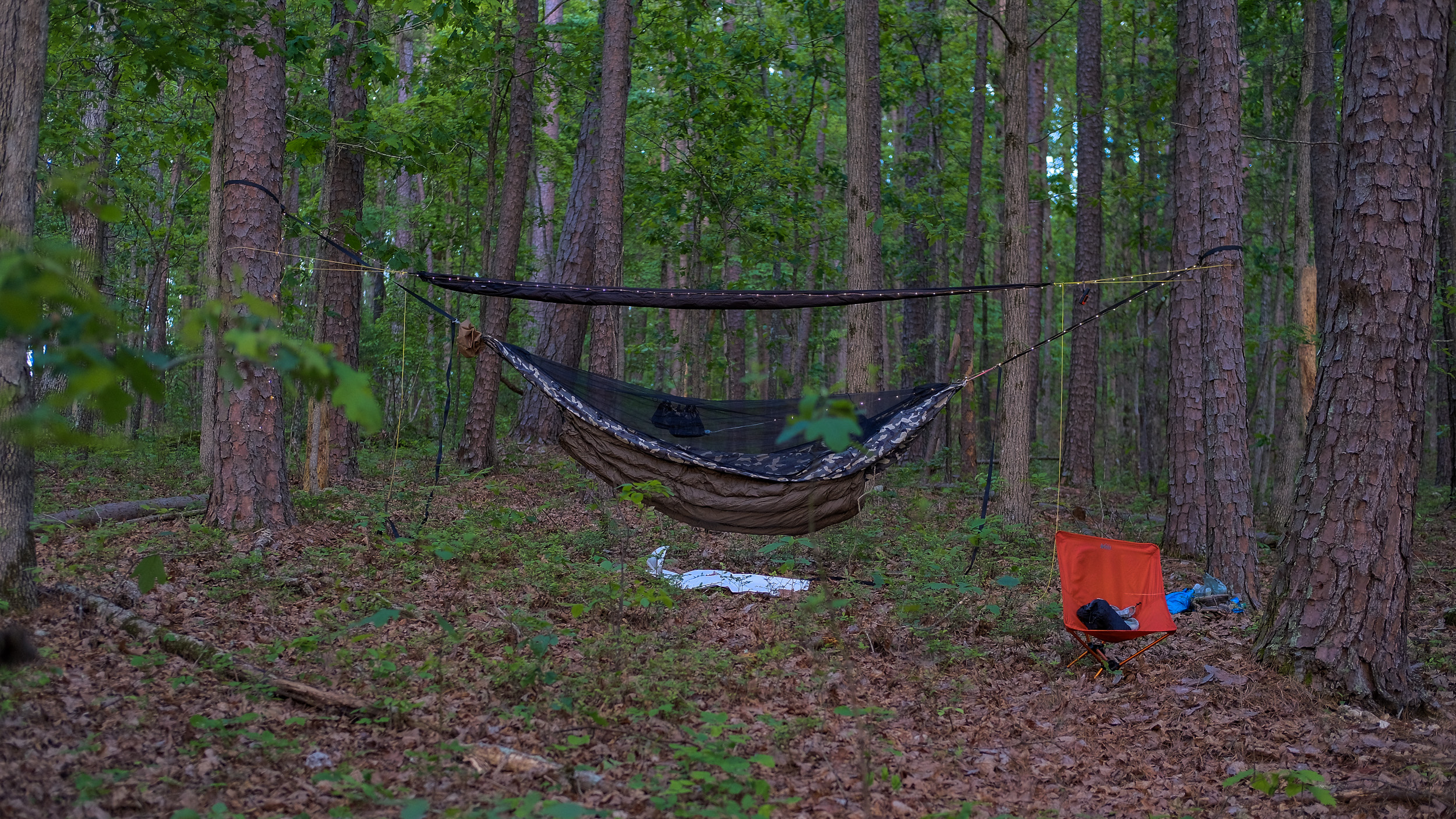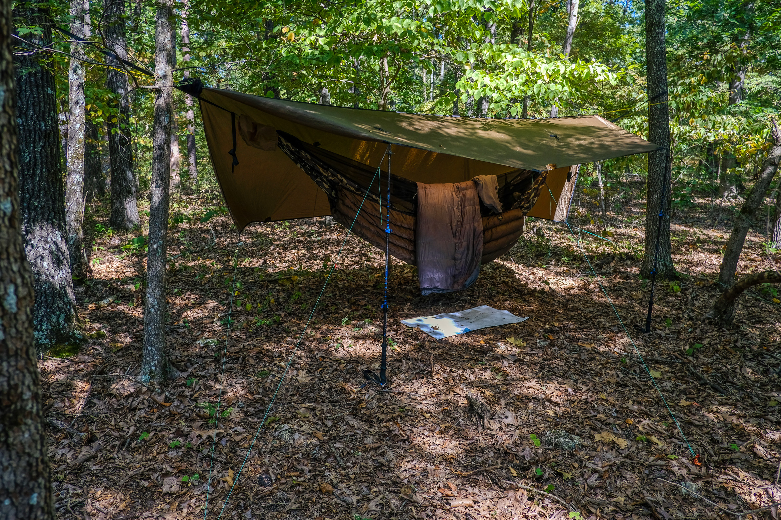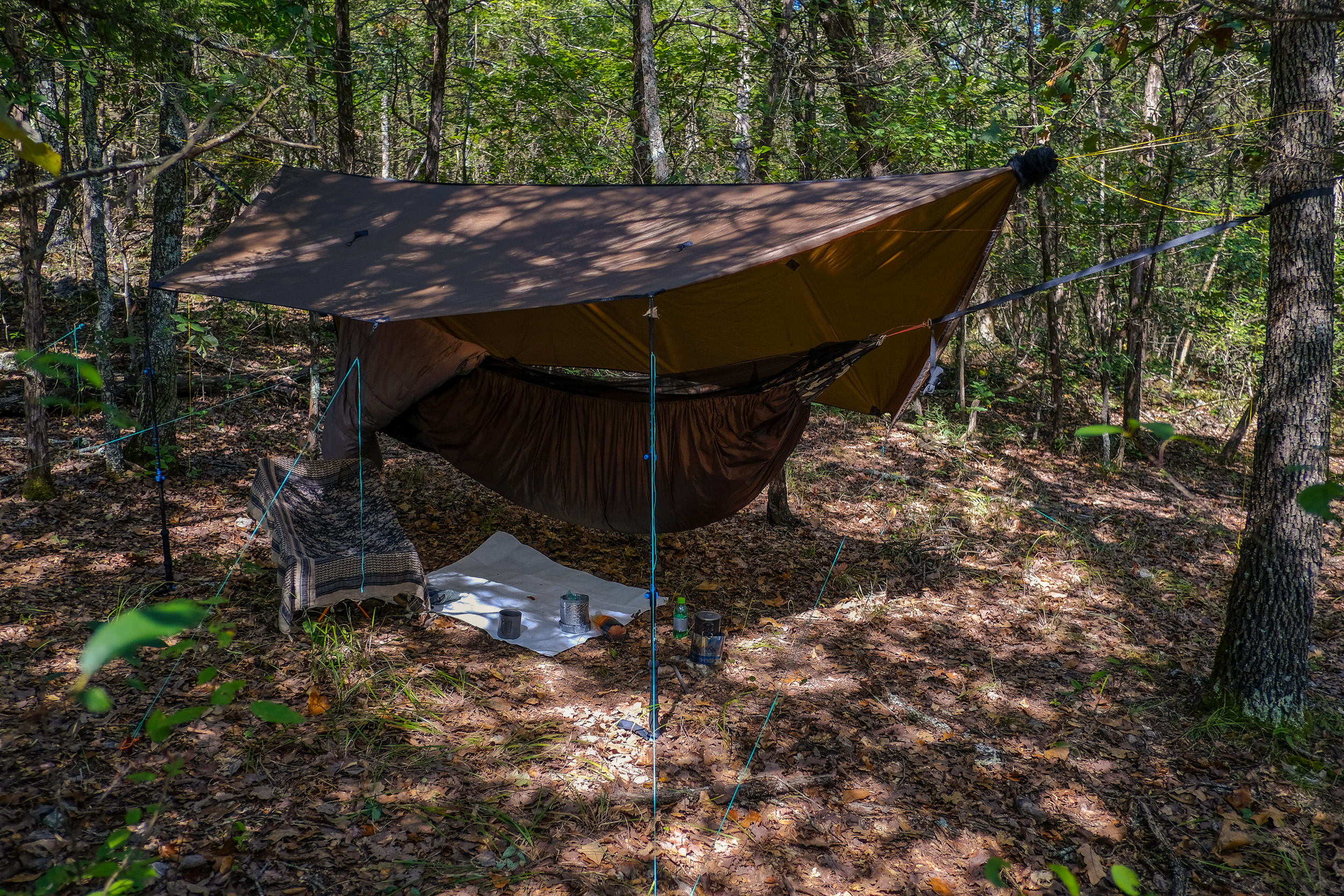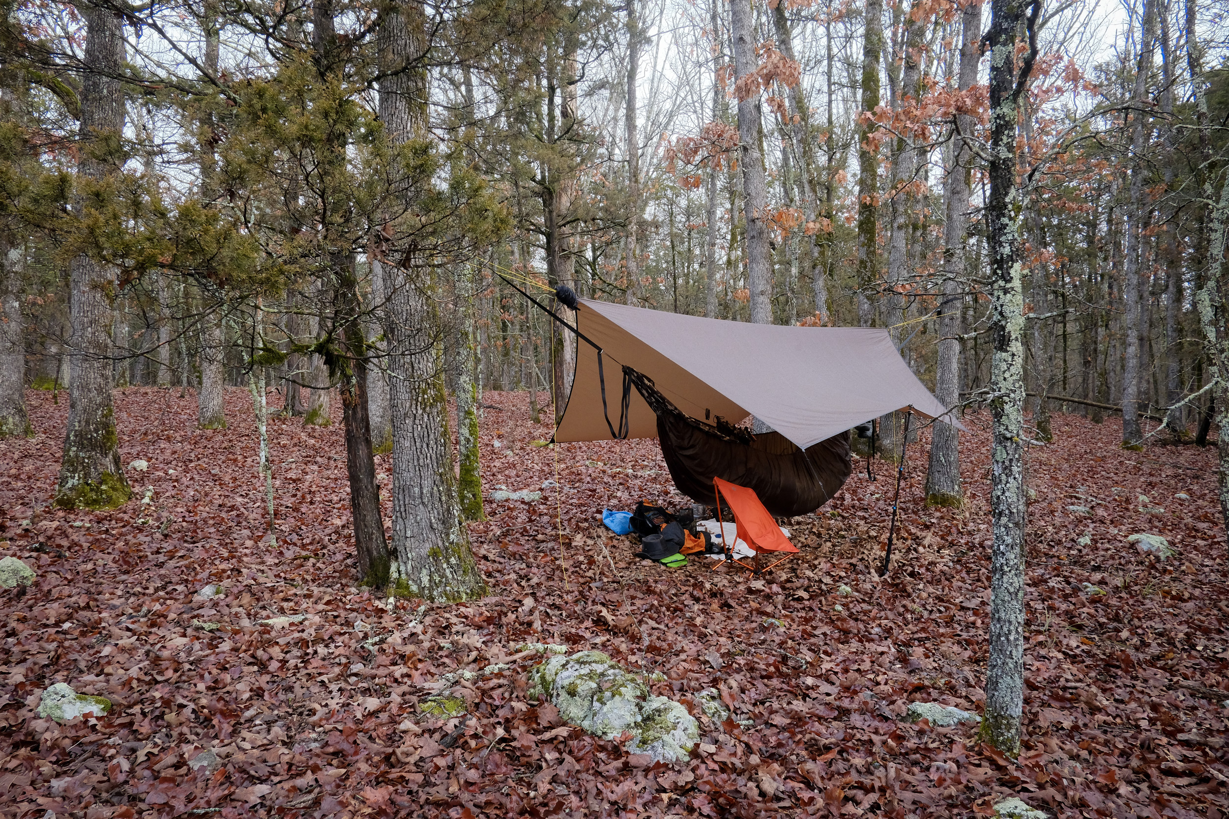 - Tarp — I invested in a Hammock gear ‘The Journey’ winter tarp, with doors, for use in colder and wetter weather.
