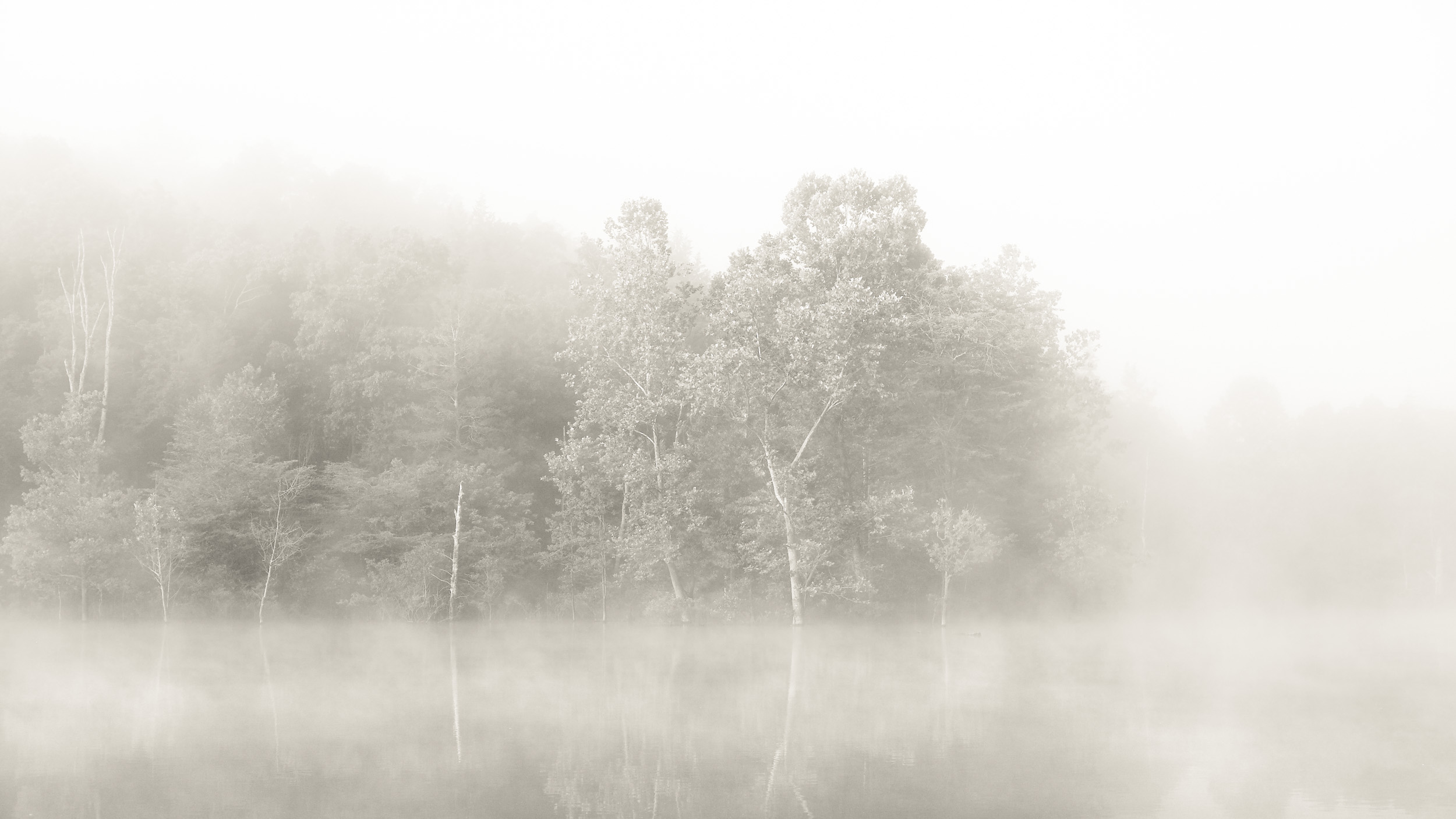 Through the veil – looking across the lake, the mist was lifting. Copyright © 2021 Gary Allman, all rights reserved.