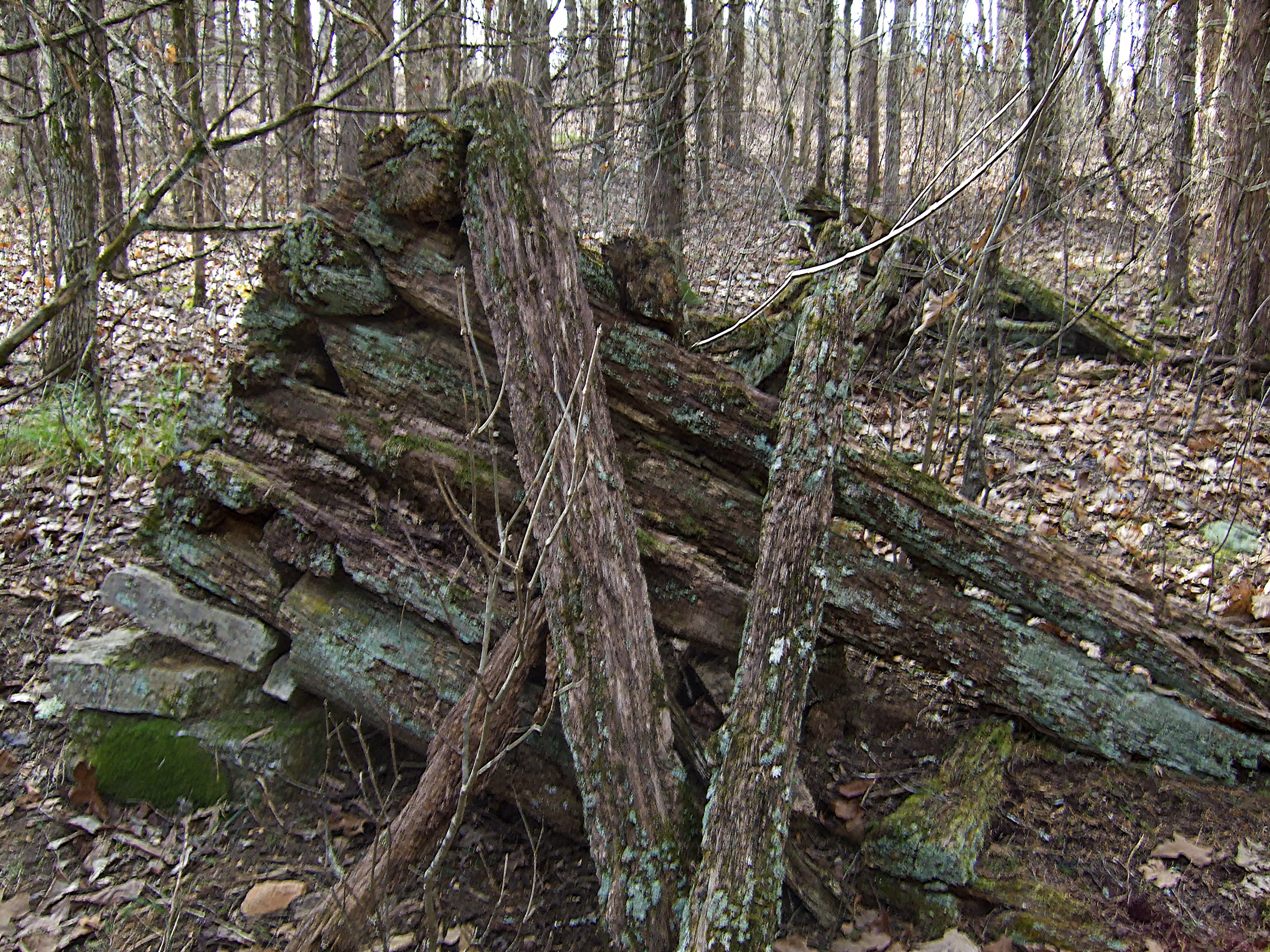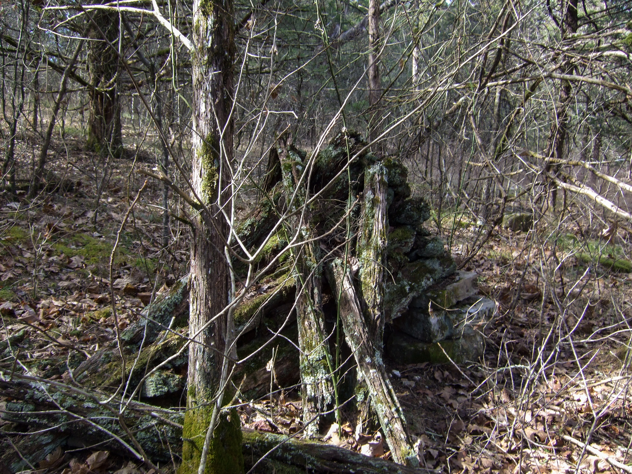 Bushwhacking back to the Pees Hollow trail we somehow manged to cross the trail without realizing it and went about 200 yards past it before we realized and back-tracked. It was a lucky mistake as on our way back to the trail we found an old ruined log cabin or barn. Ginger says cabin. But the lack of a fireplace and the raised floor suggests to me that it was a barn.