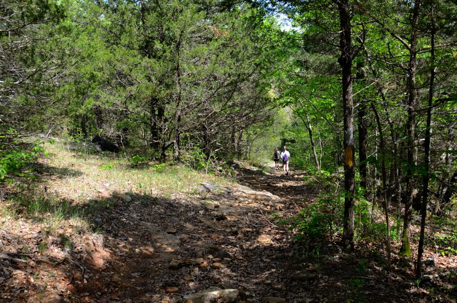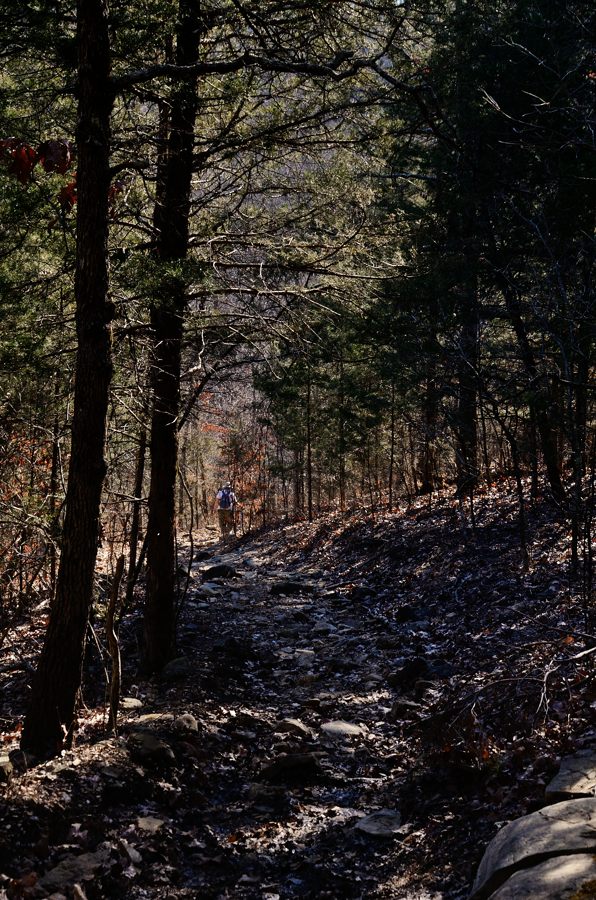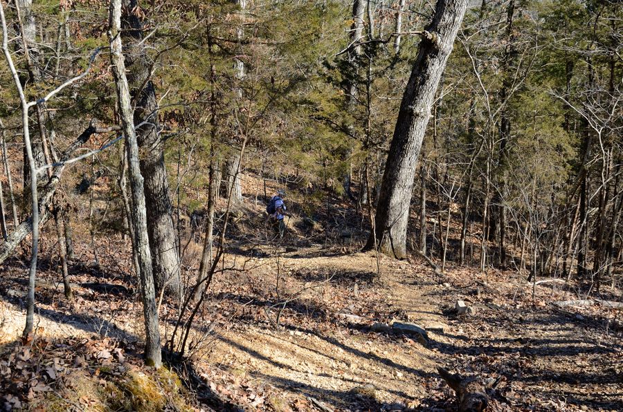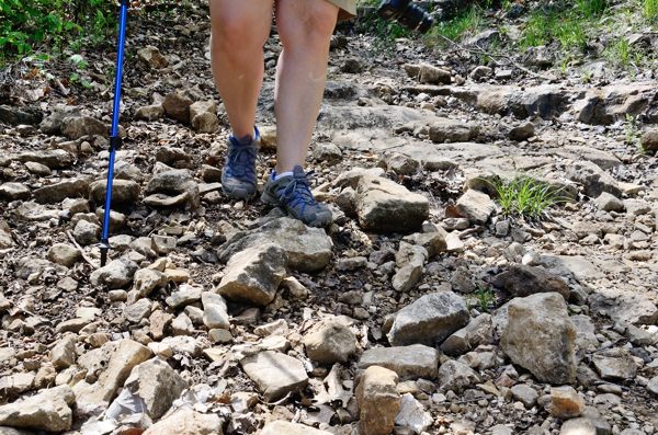 The downhill sections of trails in the Ozarks can have quite difficult footing. A hiking pole gives stability and balance and would help stop your fall in the case of a stumble on these rocks.