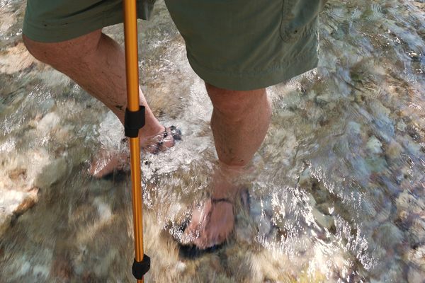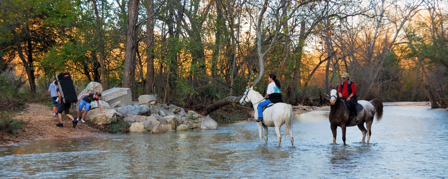 Horses and hikers crossing Woods Fork near the Eastern Trailhead. The rough gravel creek bed is very hard on bare feet