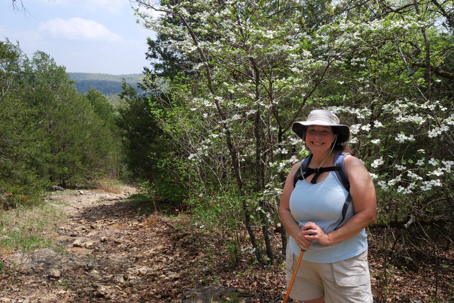 Ginger wanted to see the Dogwoods in bloom. Today we went on a short, three mile hike on the silver trail at Busiek. About half way round we stopped for lunch at a small creek and I decided to try out my new lightweight hiking tripod.