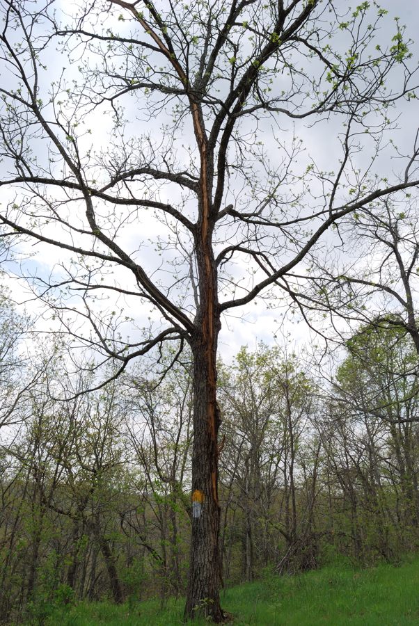 Busiek State Forest and Wildlife Area – New route of the White Trail. The new part of the trail goes to the north of this tree and then descends into the valley via a series of switchbacks.