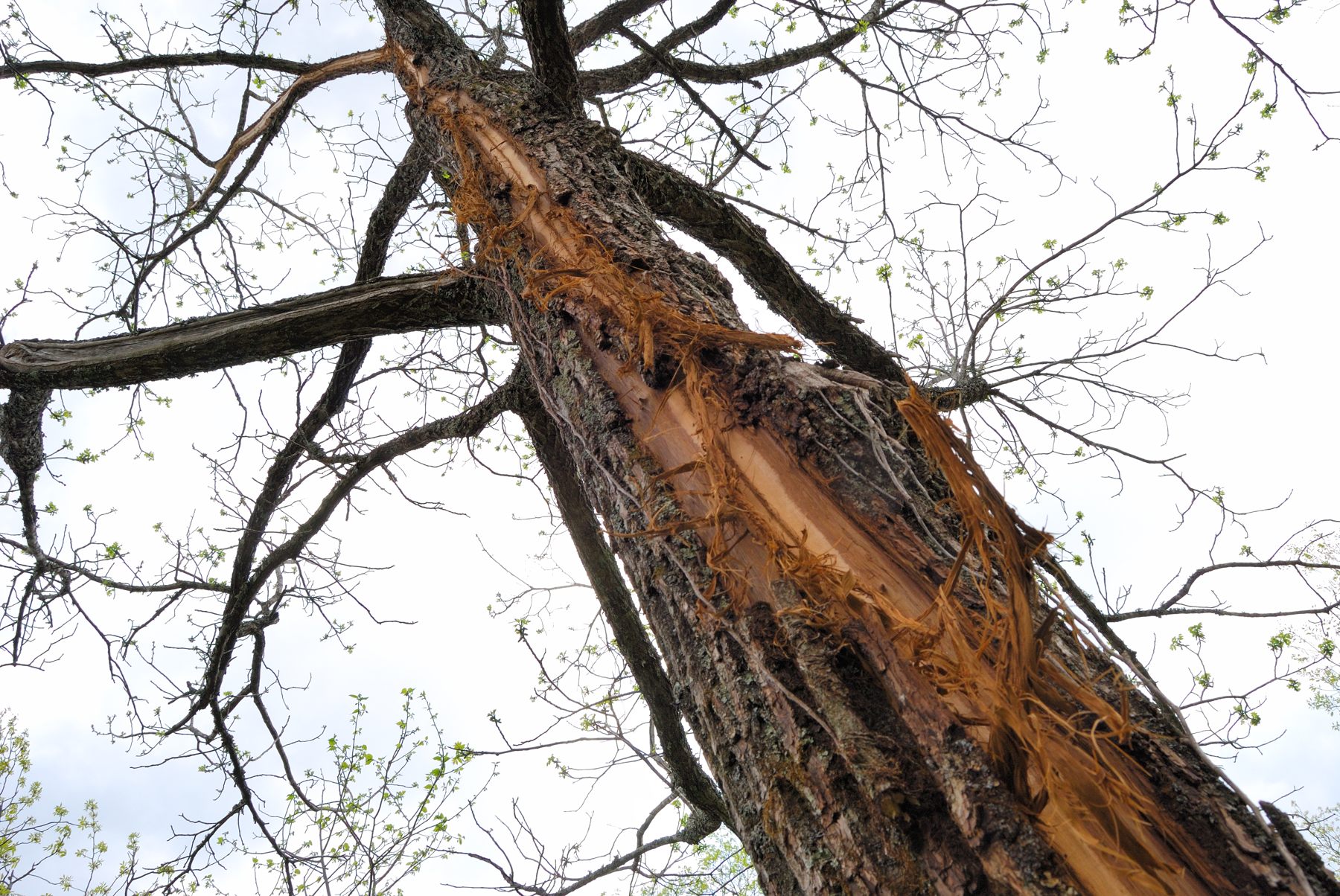 This tree is on the top of the ridge of the Yellow / Silver trail at Busiek State Forest and Wildlife Area. It was struck by lightning March/April 2011.