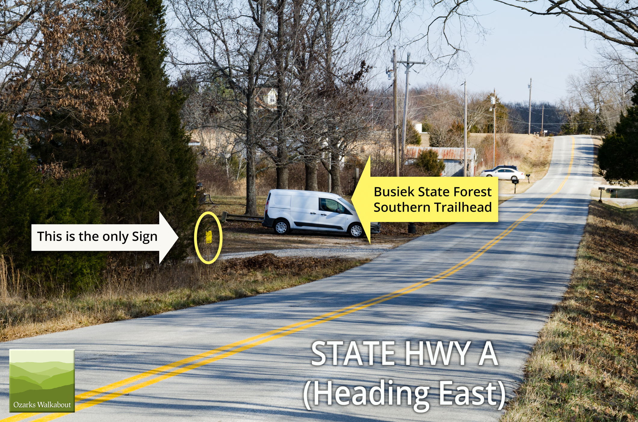 Turn Left (east) and the entrance is a small gravel road .2 miles along Highway A on the left. The road is steep and rough in places. We have no trouble getting up and down it with our van, but if you have low ground clearance it might be a problem.