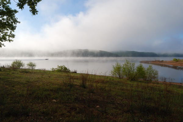 View from our tent, mist on the lake – Berry Bend, Harry S Truman Reservoir