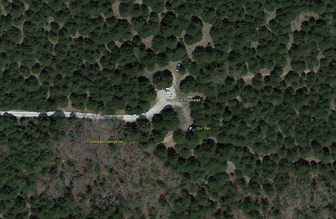 We found our van on Google Earth, it’s parked at the Coy Bald Trailhead, Hercules Glades.