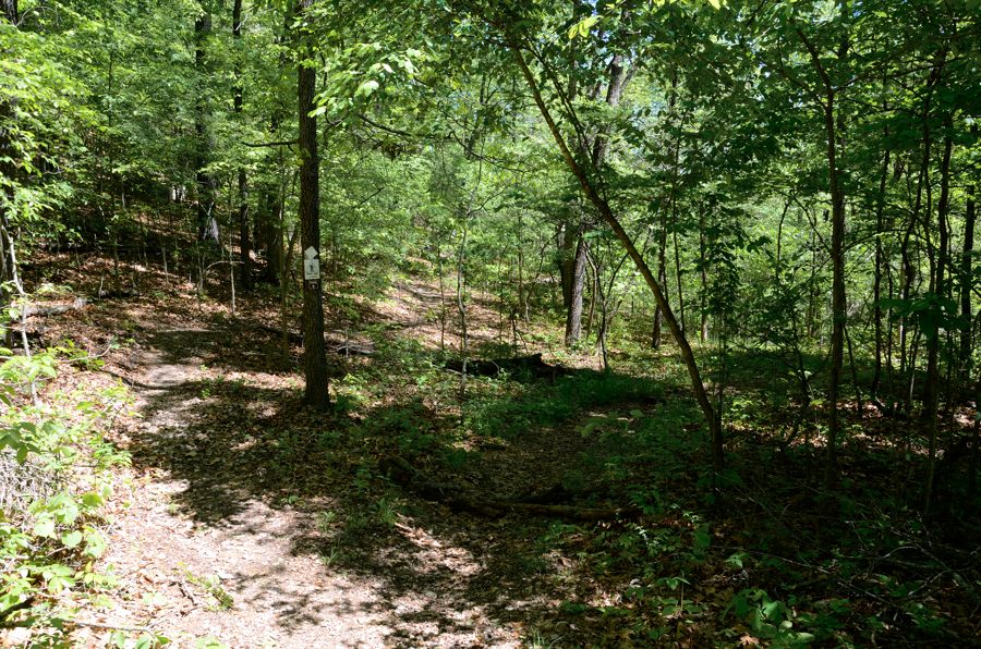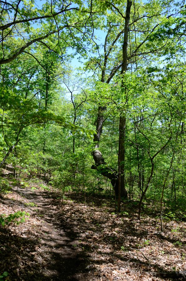Busiek State Forest and Wildlife Area - New route of the White Trail. The new part of the trail goes to the north of this tree and then descends into the valley via a series of switchbacks.