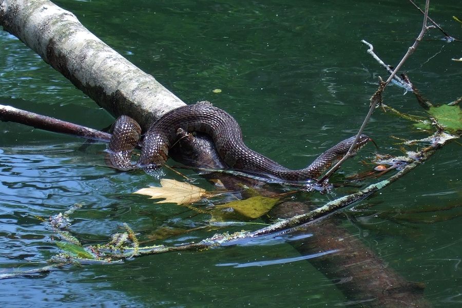 The Midland Water Snake is a non-venomous snake. It lives in or near any aquatic habitat: ponds, lakes, sloughs, streams, rivers and marshes. We frequently see them in Ozarks streams swimming in the water and hanging out along the shoreline. This one was spotted at the falls on Long Creek in Hercules Glades. It eats earthworms, slugs, snails and soft-bodied insects.
