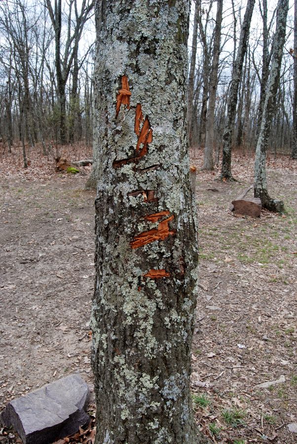 At the summit of Bell Mountain in Iron County, Missouri, we found this survey marker. It was hard to read. I think someone took the warning about defacing it as a challenge.