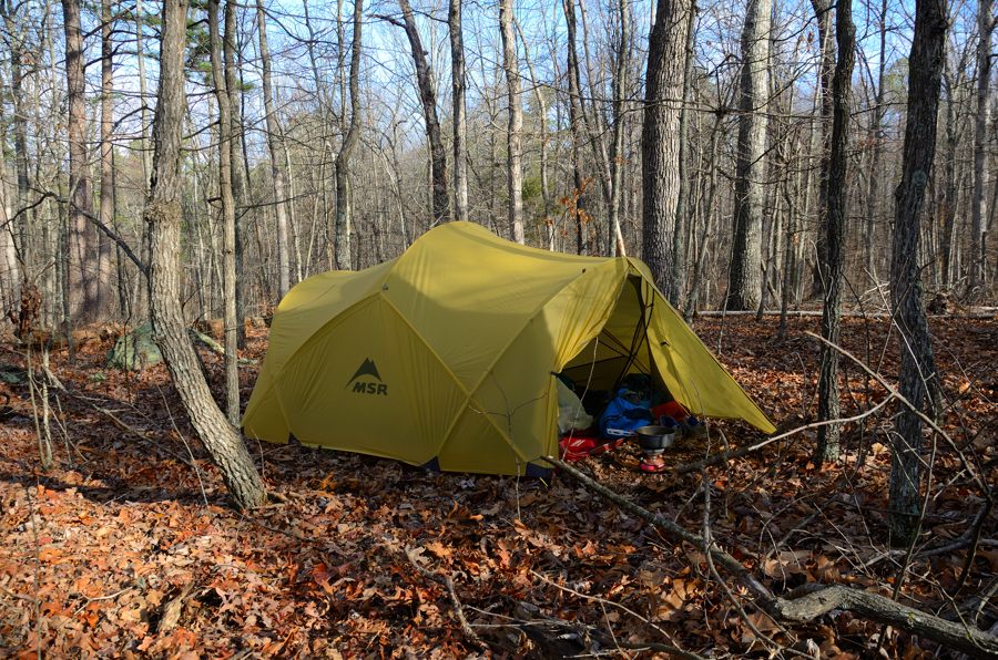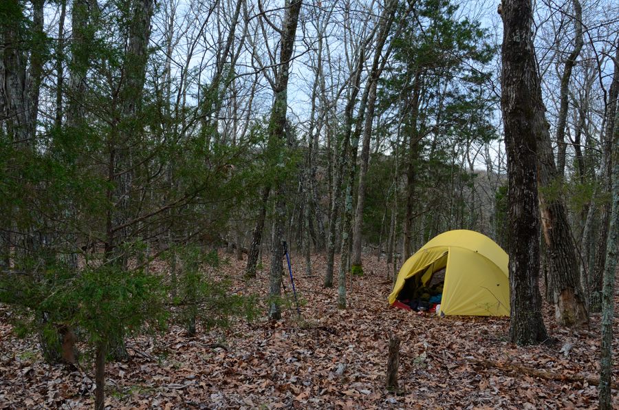 2010 MSR Mutha Hubba tent in Ozarks woodland on a ridge in the Bell Mountain Wilderness.