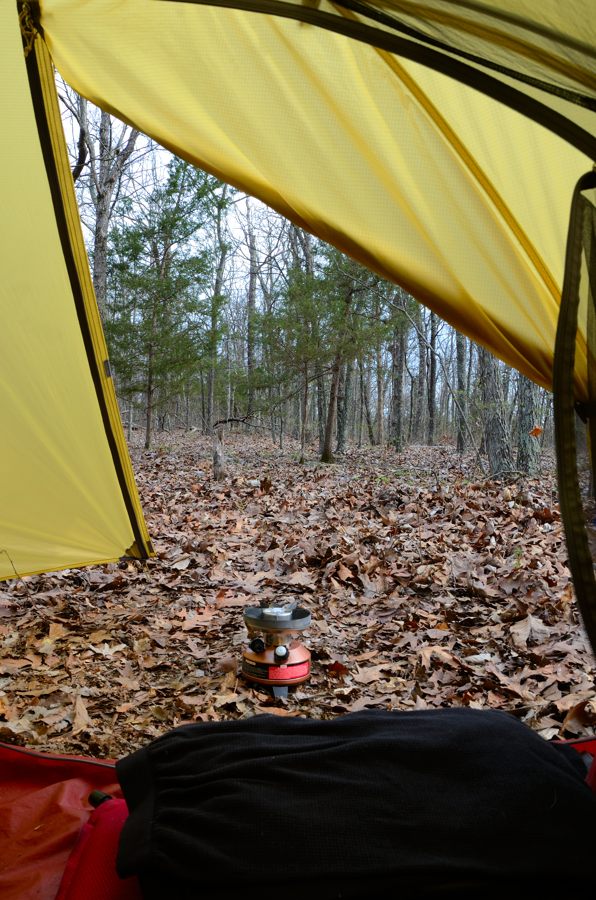 Ginger getting breakfast ready sitting in our Mutha Hubba tent. Bell Mountain Trail, Missouri