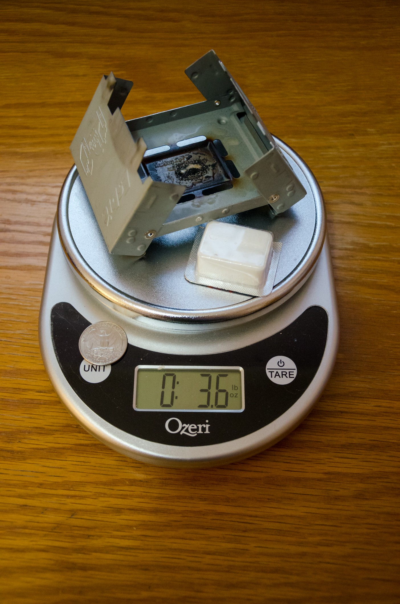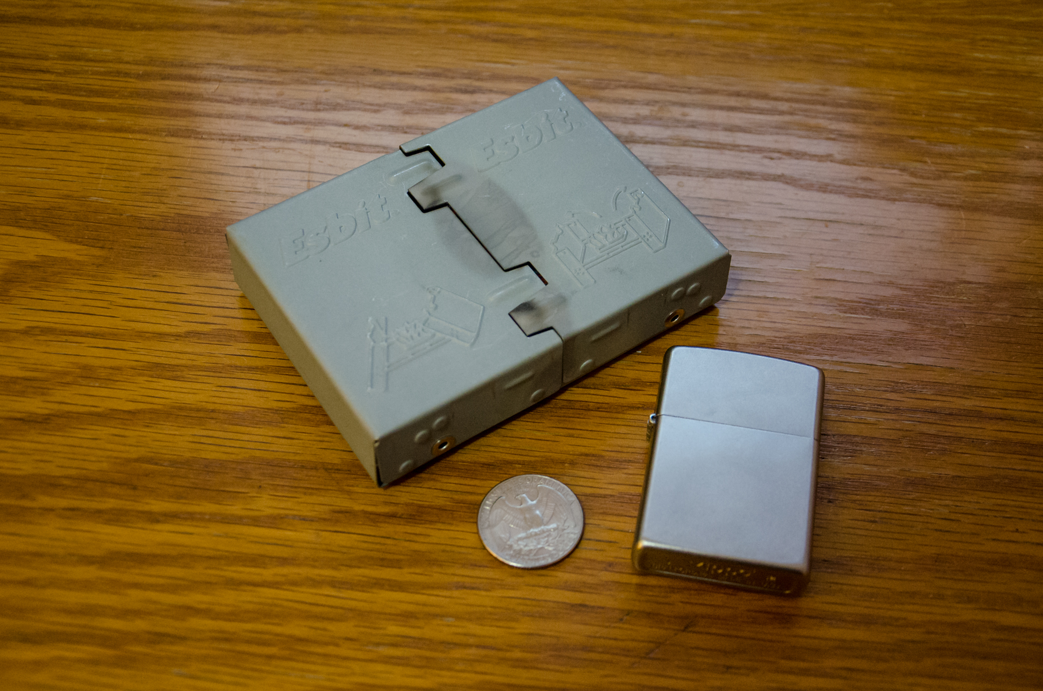 I tried to light the tab with my Zippo lighter, but that wasn’t going to happen – Zippos don’t work very well on their sides, so my spare, heavy and not so pretty, Ronson Jetlite lighter came to the rescue. As I said earlier, I forgot to pack the wind shield, and it was windy. For the moment, I’m going to give the Esbit the benefit of the doubt, and blame the lack of a windshield for the fact the water didn’t reach a rolling boil before the fuel tab was used up.