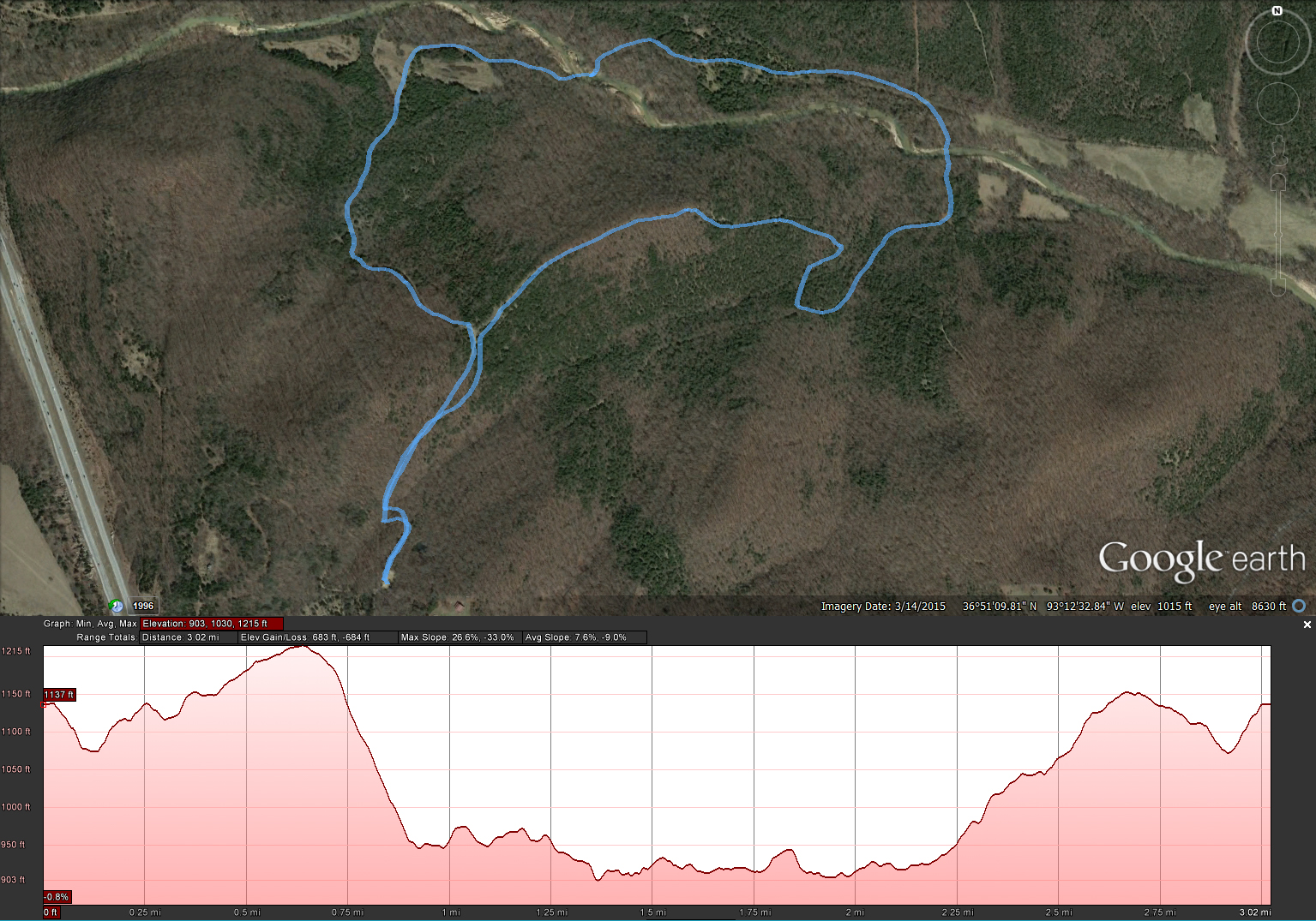 We wanted a fairly short and quick hike, plus we wanted to keep away from any other weekend hikers at the main trailheads. We opted to go counter-clockwise around the Yellow trail from the Southern trailhead, cutting the hike short by taking the shortcut across Woods Creek before the climb up onto the glades and the join with the Red trail. I’ve included our GPS track below so you can see where we went.