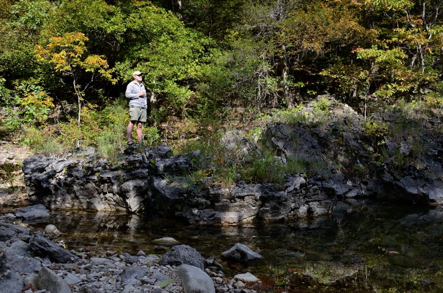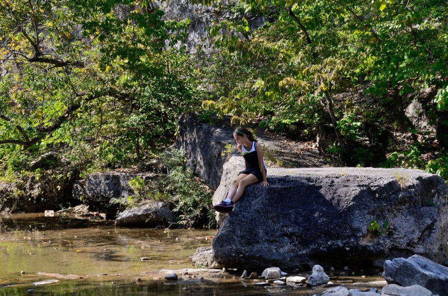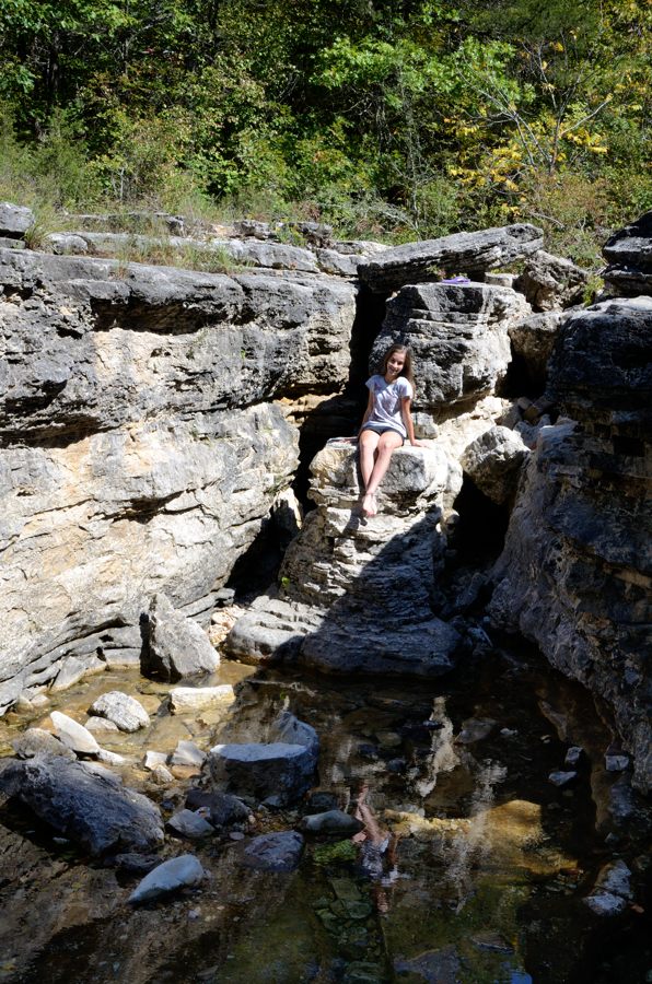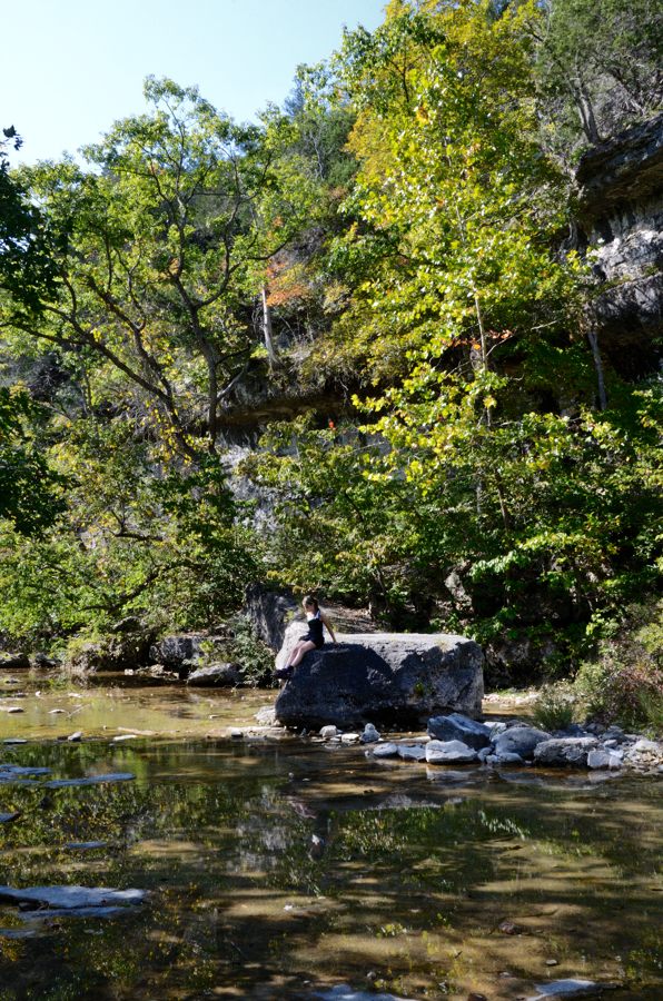 It didn’t take long to get to the bottom of the hill, and we were very pleased to see running water in Long Creek. That meant there ought to be water at the falls, and we’d be able to stay as long as we wanted. We let Lanie enjoy the view of the bluffs and climb around on the boulders while we prepared for the hard slog up the Devil’s Den West Trail, which climbs the 300 ft up the other side of the valley.