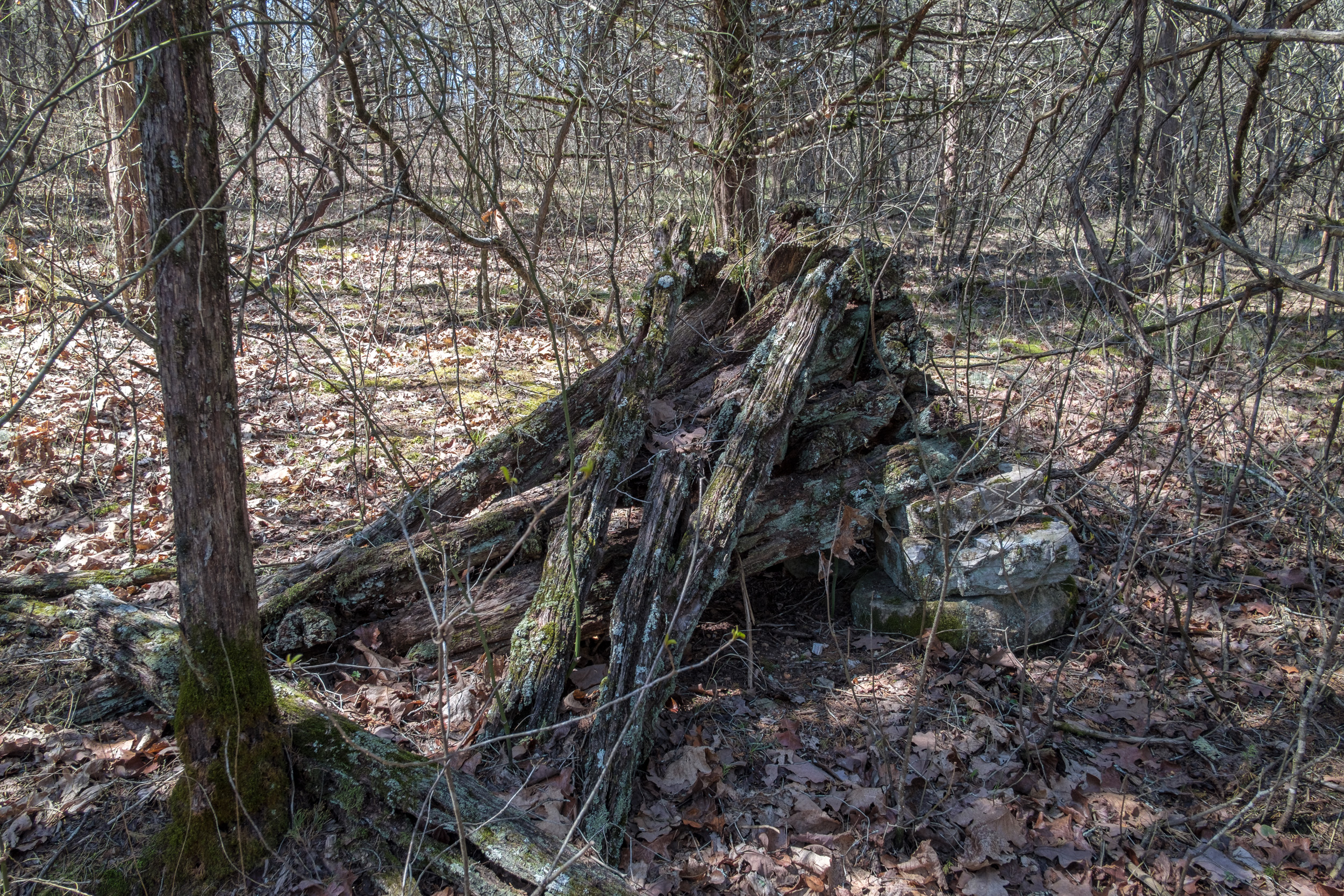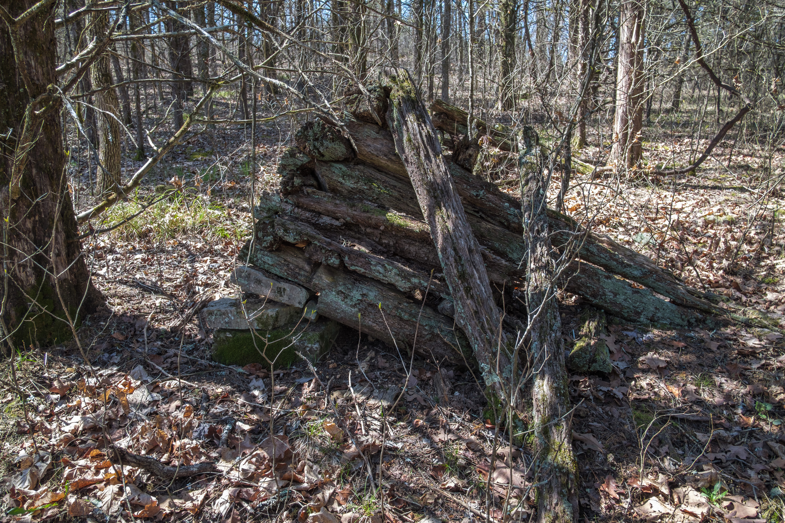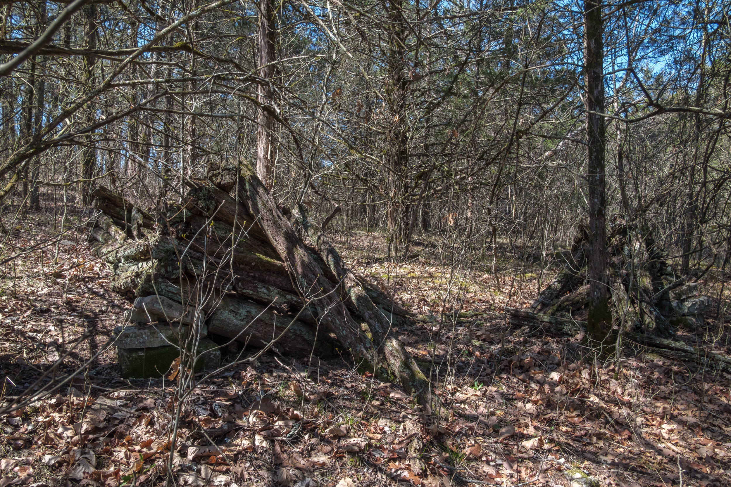 Back in 2011 We did a similar one-night backpacking trip on the Pees Hollow Trail. Bushwhacking back to the trail from our campsite we missed the trail and found the remains of an old Ozarks cabin. I wanted to try and find it again so I could take some better pictures and geotag it. It was somewhere just before Brushy Creek (a very apt name by the way, it is very brushy!) Half an hour after setting out in the morning, I was moving off-trail to quarter the area looking for the cabin. I was lucky and found it almost immediately. The cabin must have had a great view of Brushy Creek when all the intervening brush was cleared.