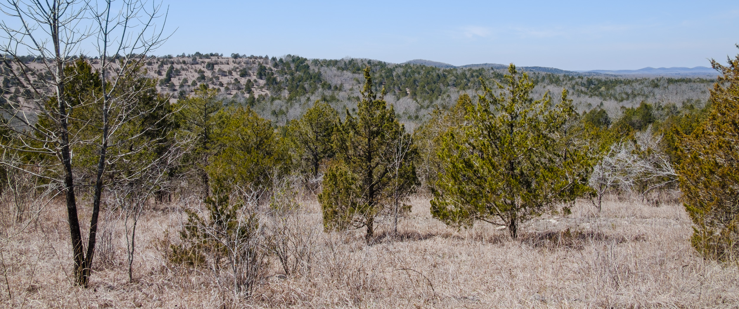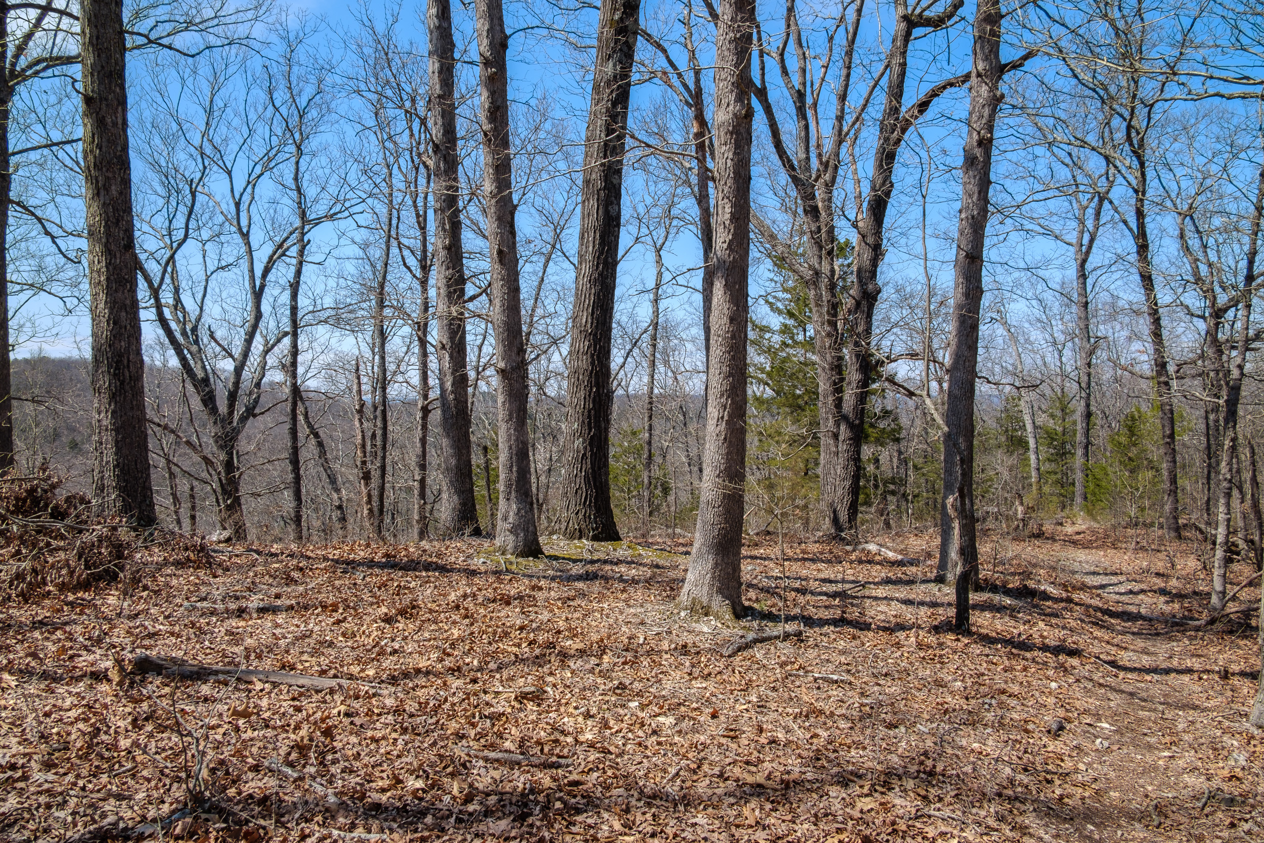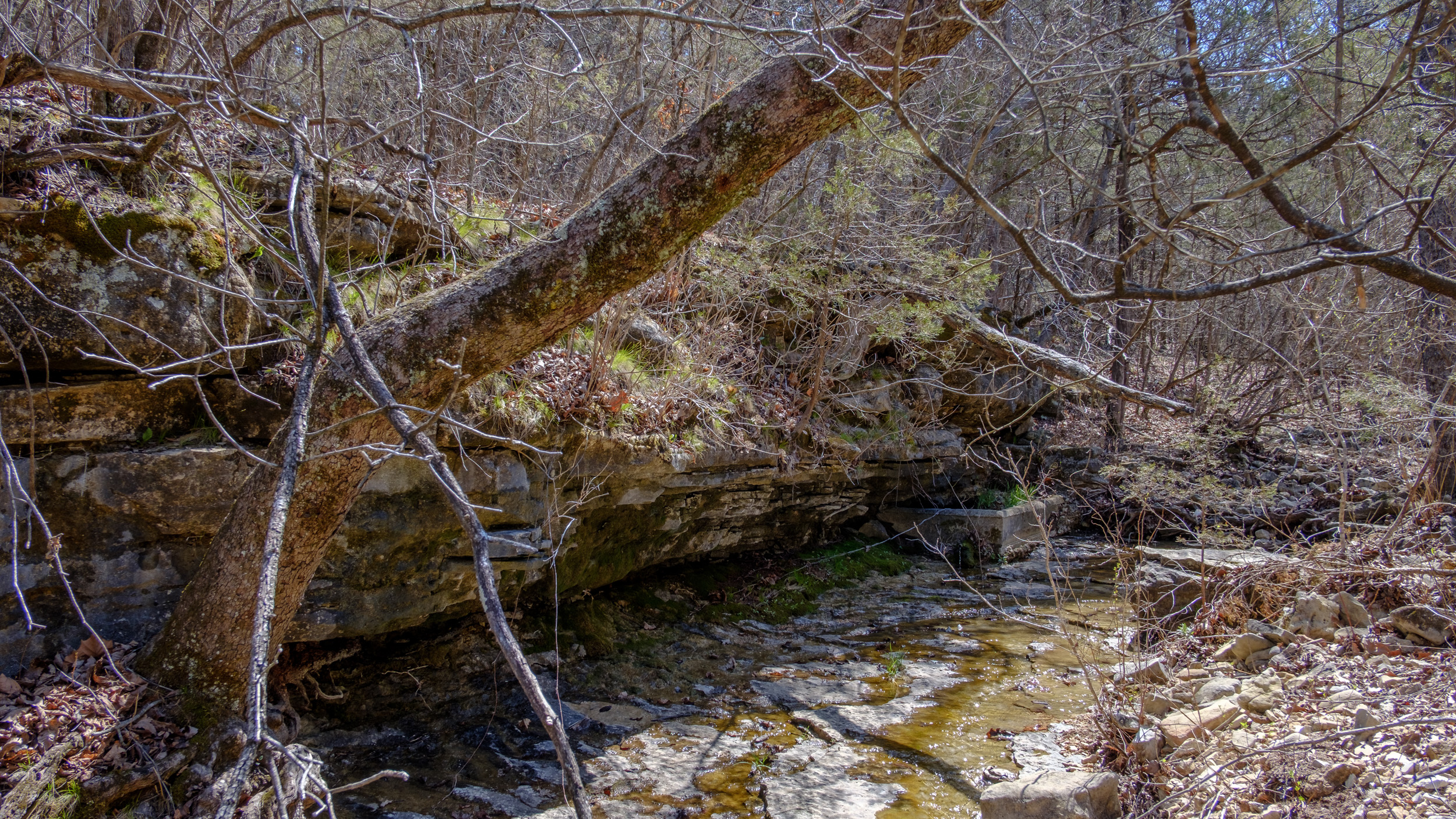 Back in 2011 We did a similar one-night backpacking trip on the Pees Hollow Trail. Bushwhacking back to the trail from our campsite we missed the trail and found the remains of an old Ozarks cabin. I wanted to try and find it again so I could take some better pictures and geotag it. It was somewhere just before Brushy Creek (a very apt name by the way, it is very brushy!) Half an hour after setting out in the morning, I was moving off-trail to quarter the area looking for the cabin. I was lucky and found it almost immediately. The cabin must have had a great view of Brushy Creek when all the intervening brush was cleared.