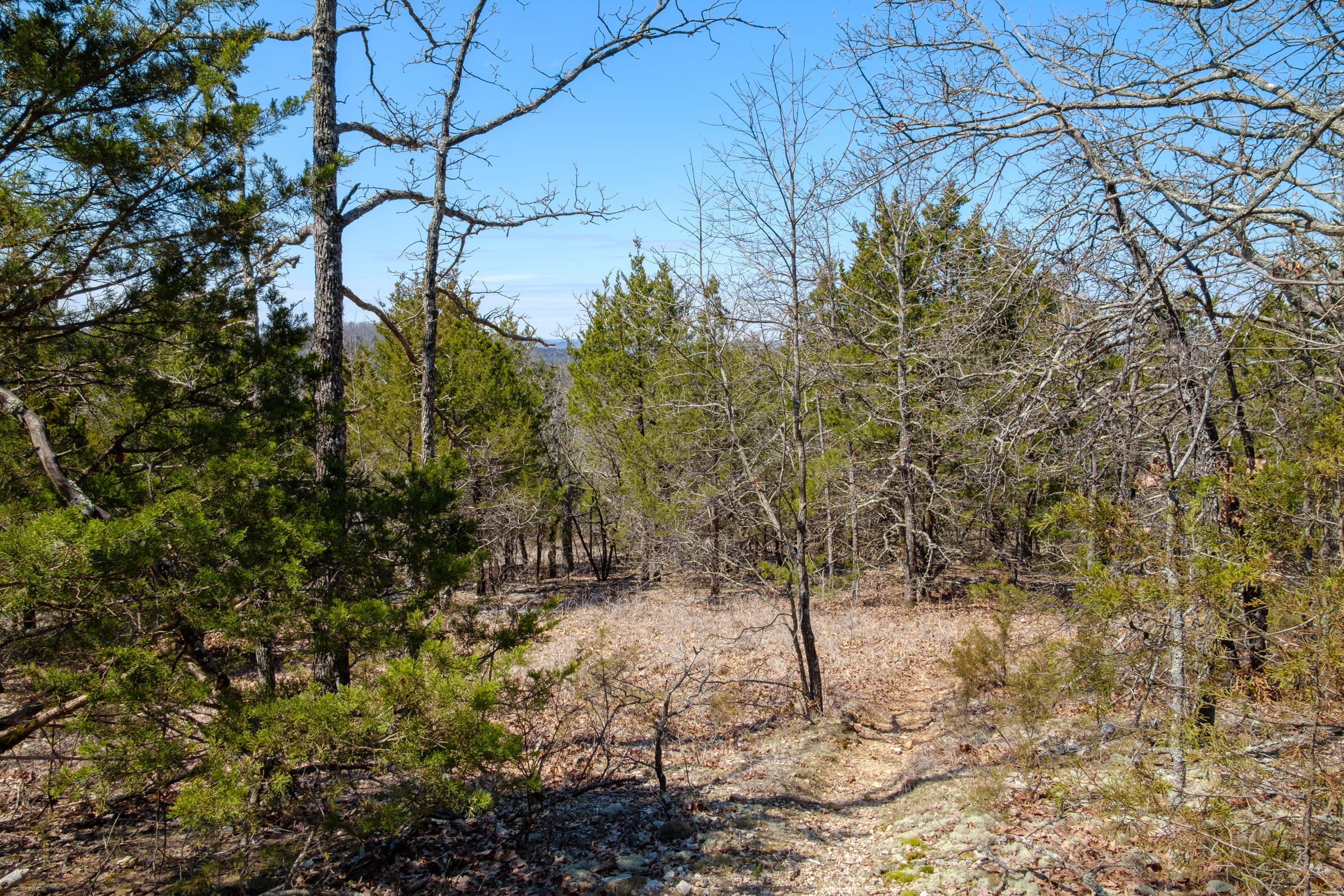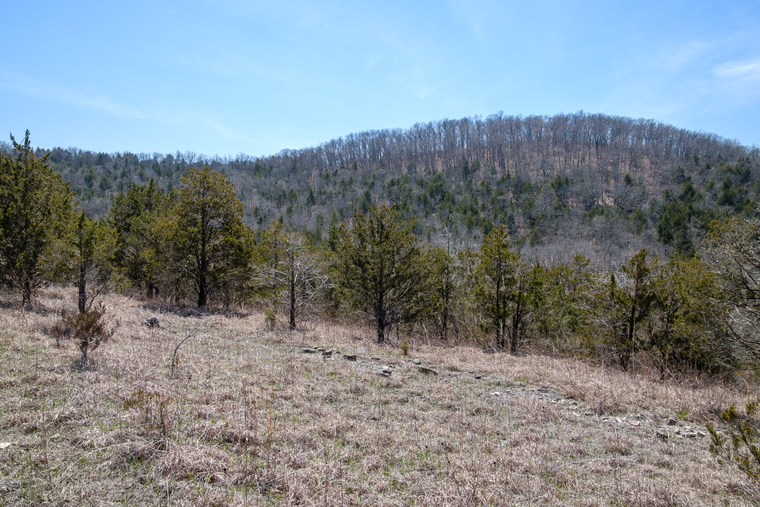 There is only one spot on this half of the Pees Hollow loop where it’s easy to miss the trail, and that’s a little over half a mile in. After you’ve dropped off of the ridge, you start to go south-west across the glade that is rapidly becoming overgrown. It feels like you are, almost doubling back. After a while, there’s a point where the trail crosses a small creek on the right, and that can be easy to miss.
