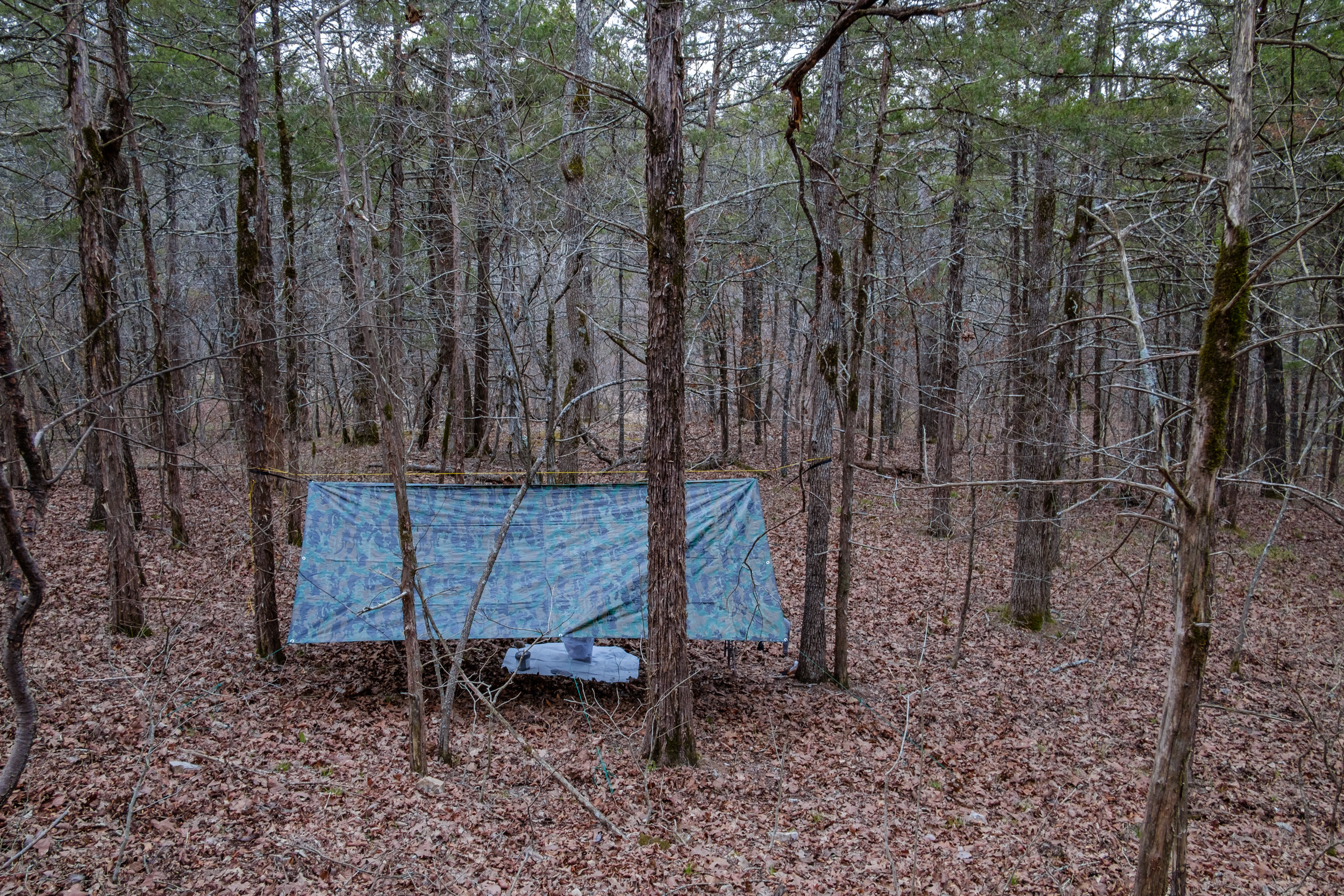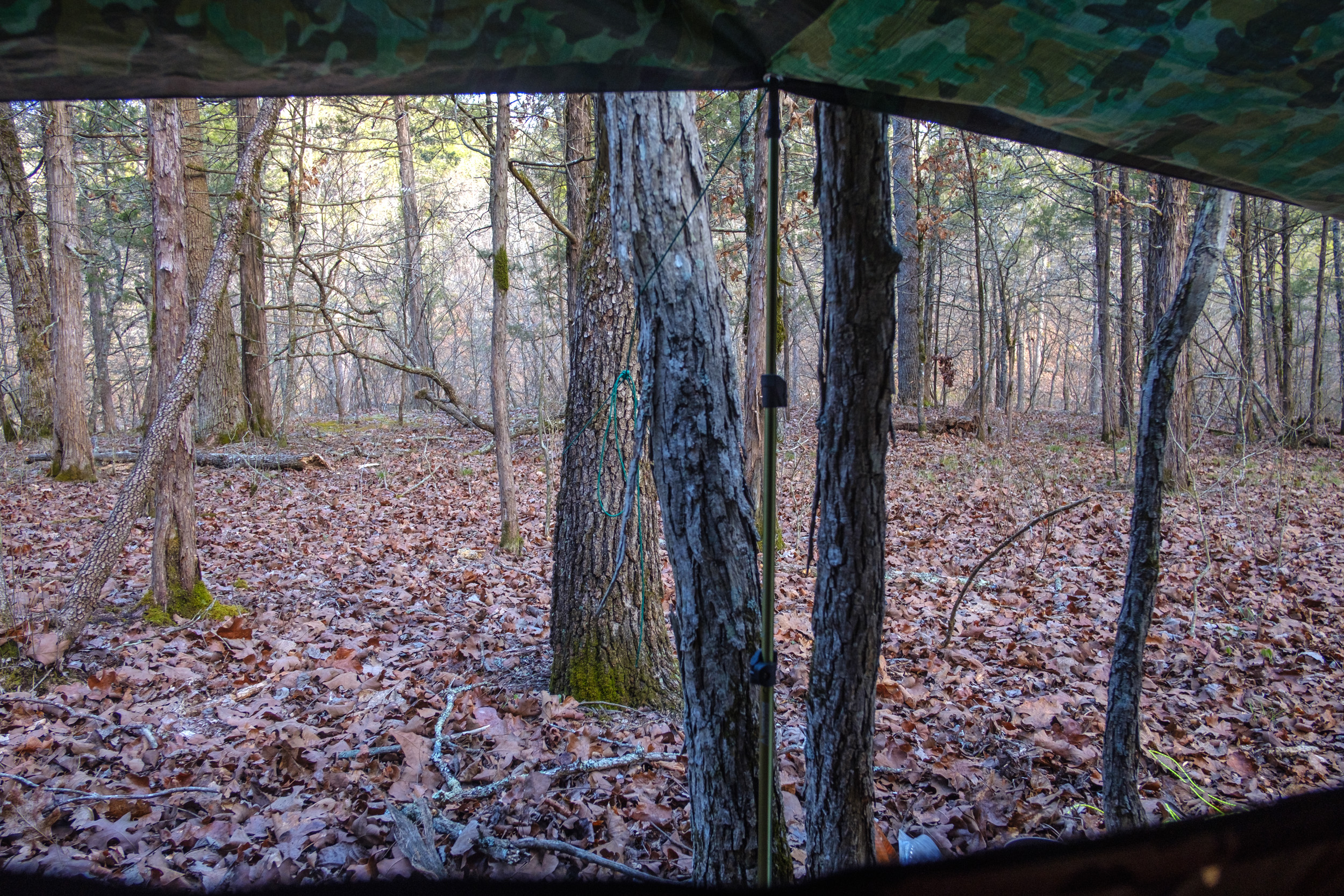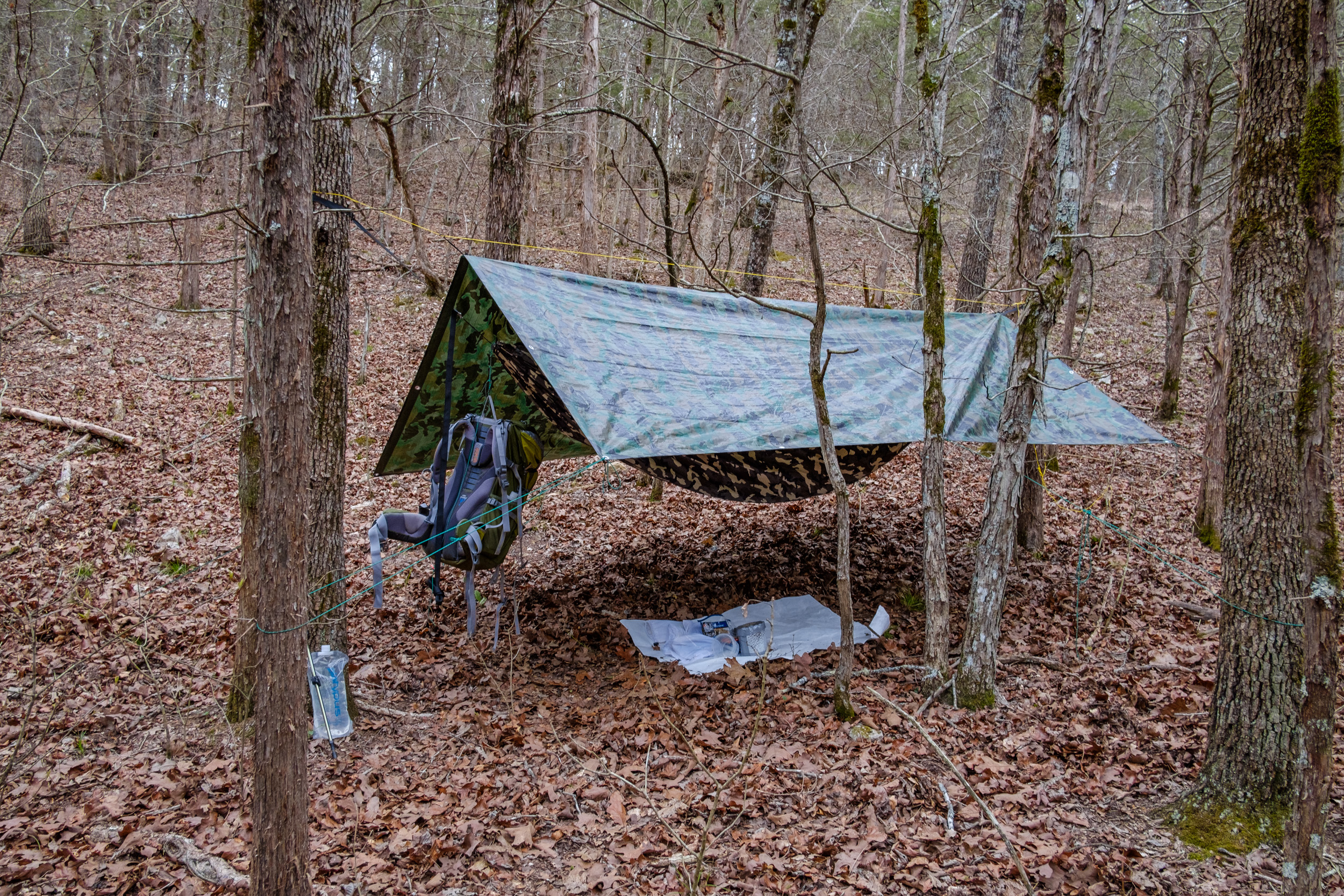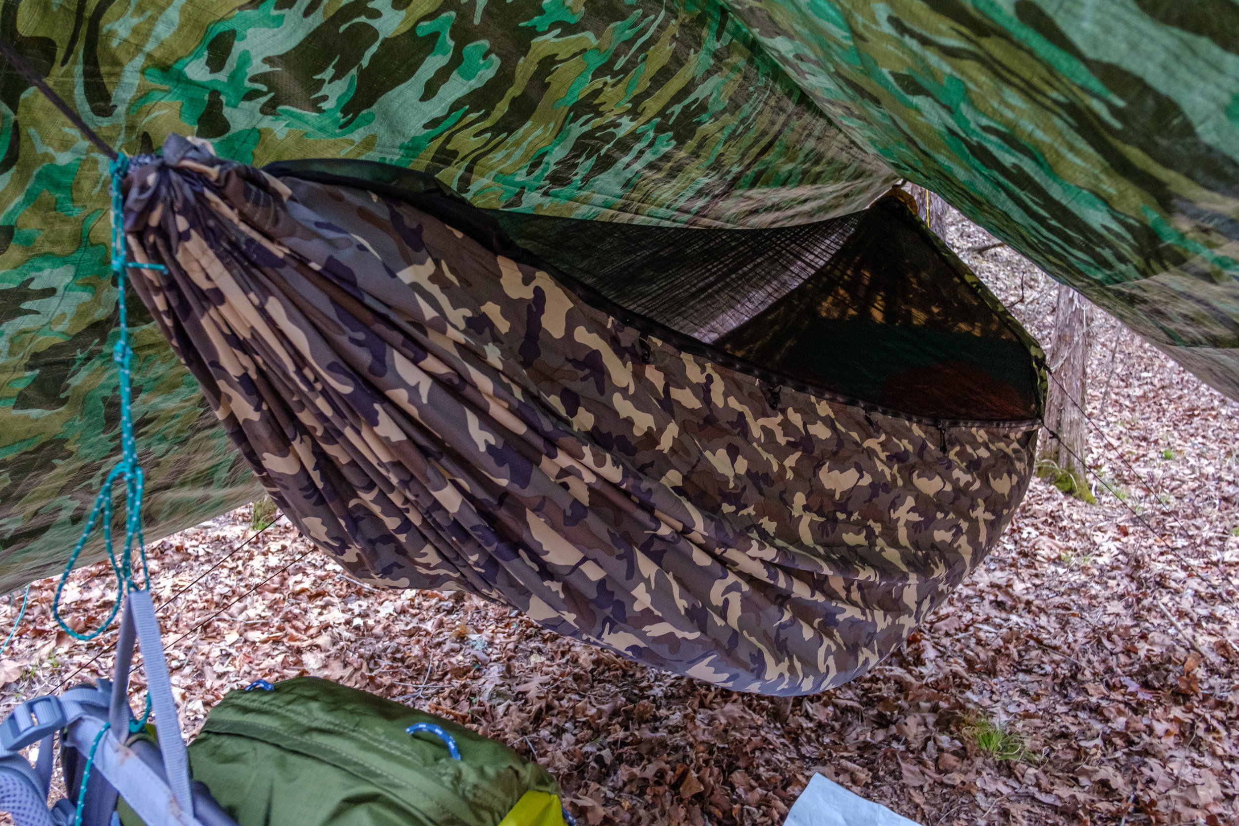 DutchWare Gear Chameleon hammock. When I first saw this picture I thought I’d set the hammock up wrong. Then I realized it’s just the weight of the backpack pulling the near end down.
