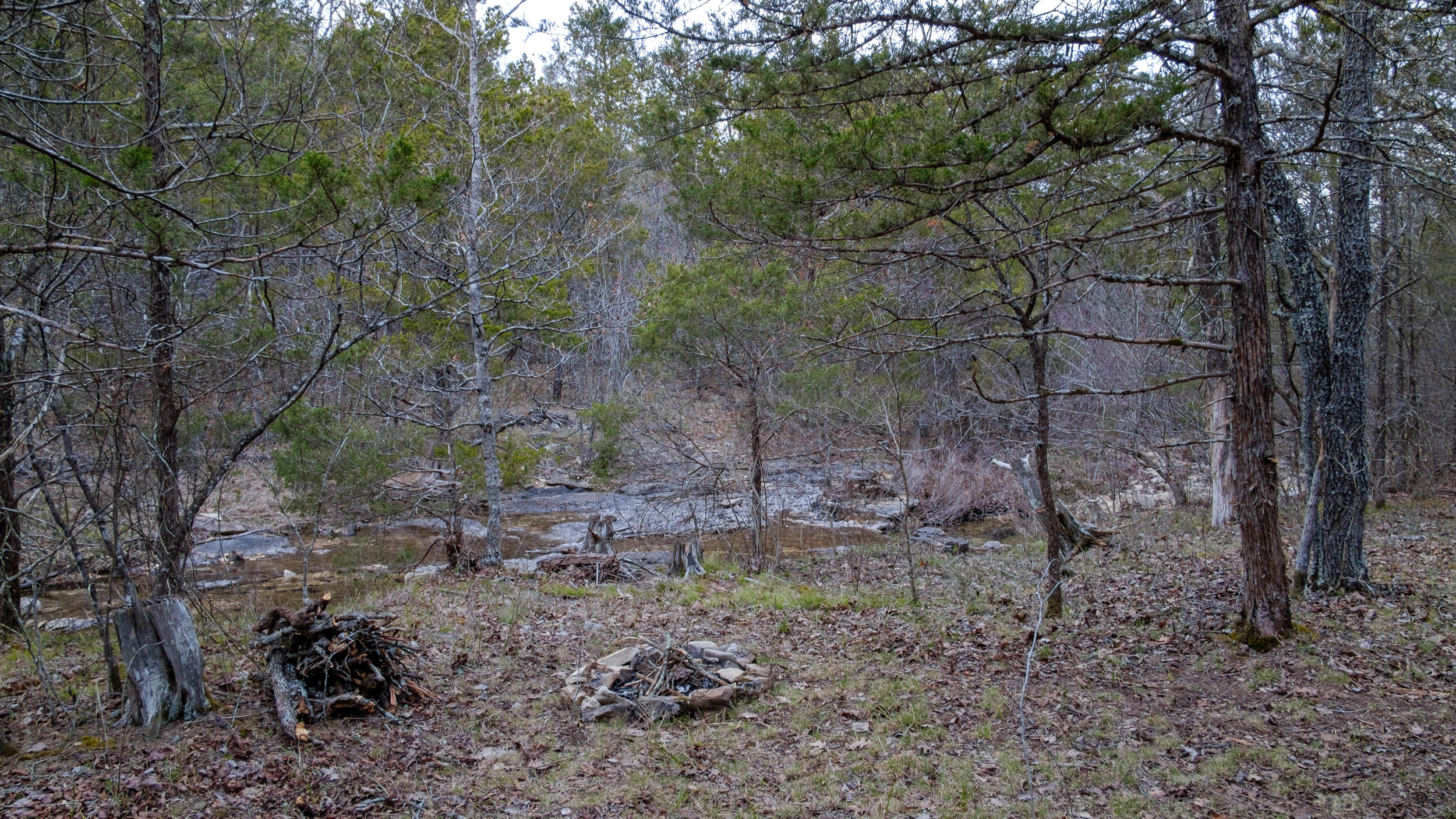 After a short walk on this little-used side-trail, I found a nice little fire ring next to the creek. There was a spot I could have hung my hammock across the trail there, but I decided to go a bit further on and set up well back from the trail.
