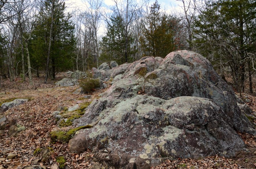 Eager to find a new sort of ground to cover, we turned our attention to the St. Francois Mountain area for our Spring Break trip. The St. Francois Mountains are an ancient granite mountain range that stands, literally, as an island in the limestone and dolomite former sea beds that are the Ozarks Plateau. Instead of the usual tan and white Ozarks rocks, this region is strewn with boulders and rocks of maroon rhyolite and pink granite.