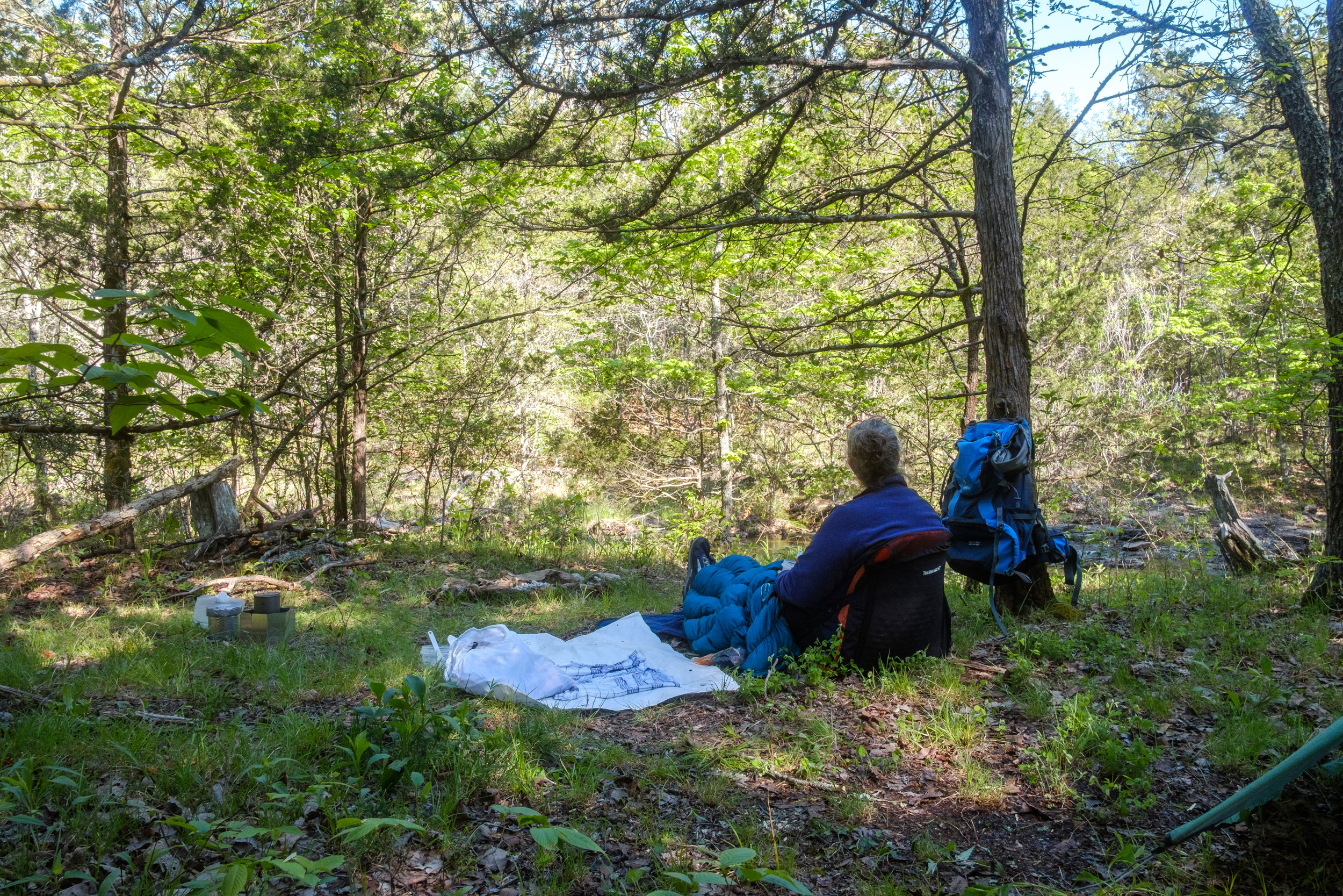 The fire ring is quite close to the creek, and we camped closer than the 100′ restriction on camping near to water sources. However, the hollow isn’t very wide here, the hill starts to climb up immediately behind where we camped. Where we set up camp was clear of brush, and a lot less damaging place to camp than up the hill in the brush.