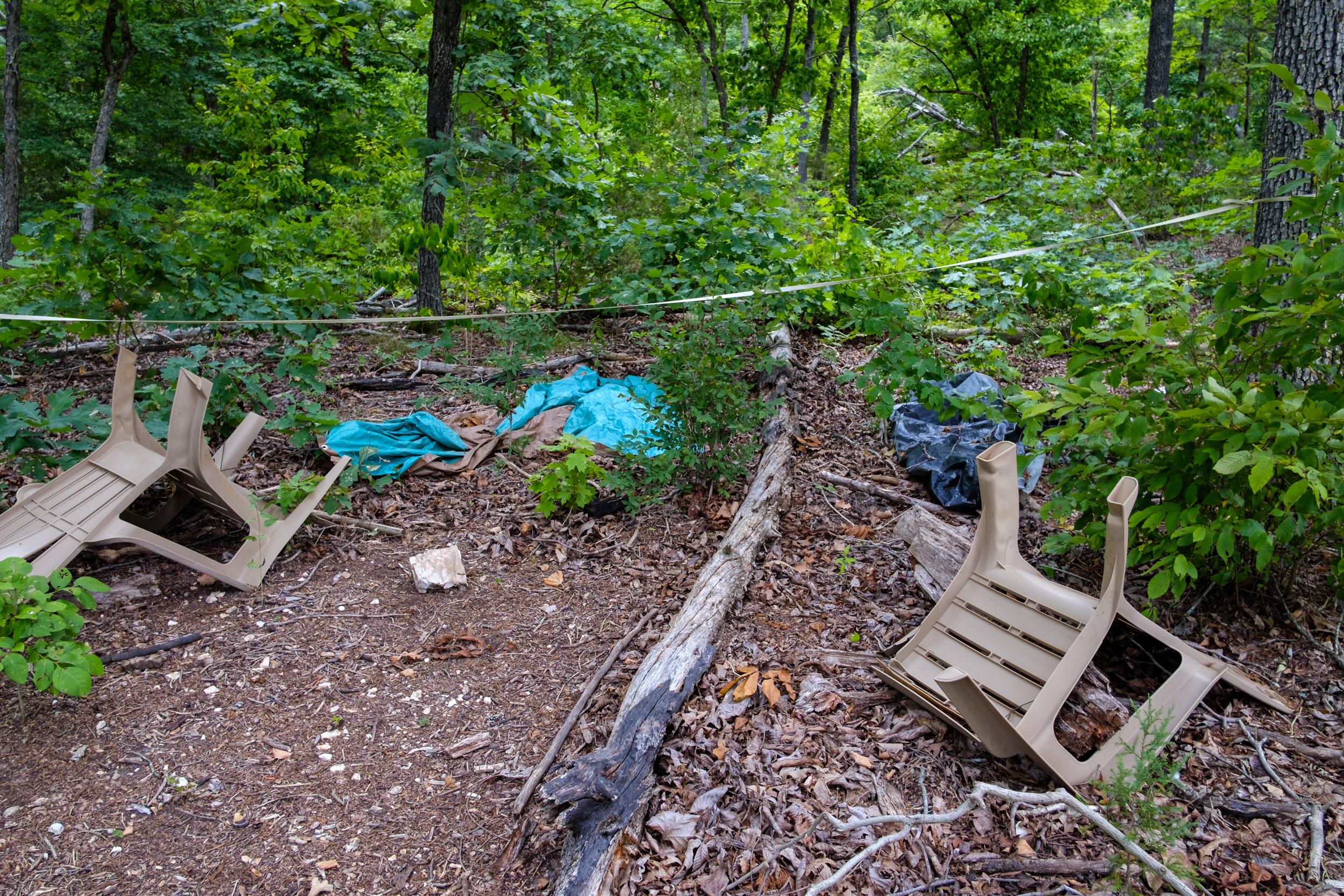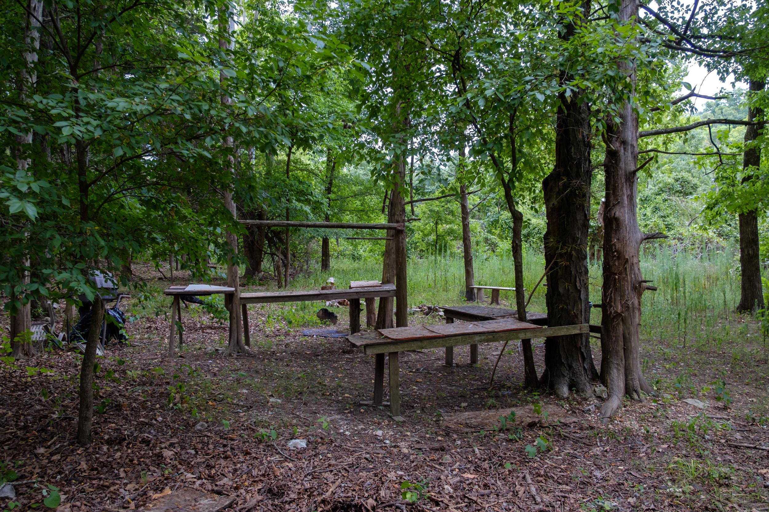 Before long I started seeing signs of a man-made trail and it led me to a broken down fishing/hunting camp. Nearby I found two more, the last of which was impressive in size while hugely disappointing in its accompanying Ozarkian detritus and trash. Apparently “Leave No Trace” has no meaning to at least three groups of people hunting and fishing in the area. The images are geotagged if any public-spirited person with a big boat fancies going in and clearing the mess out.