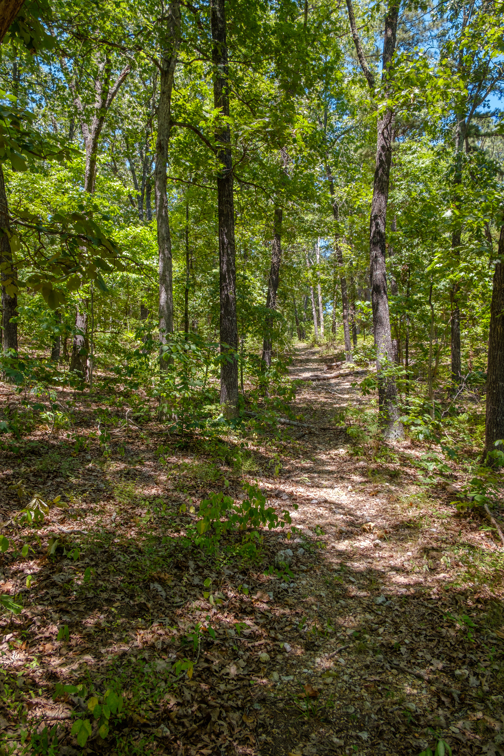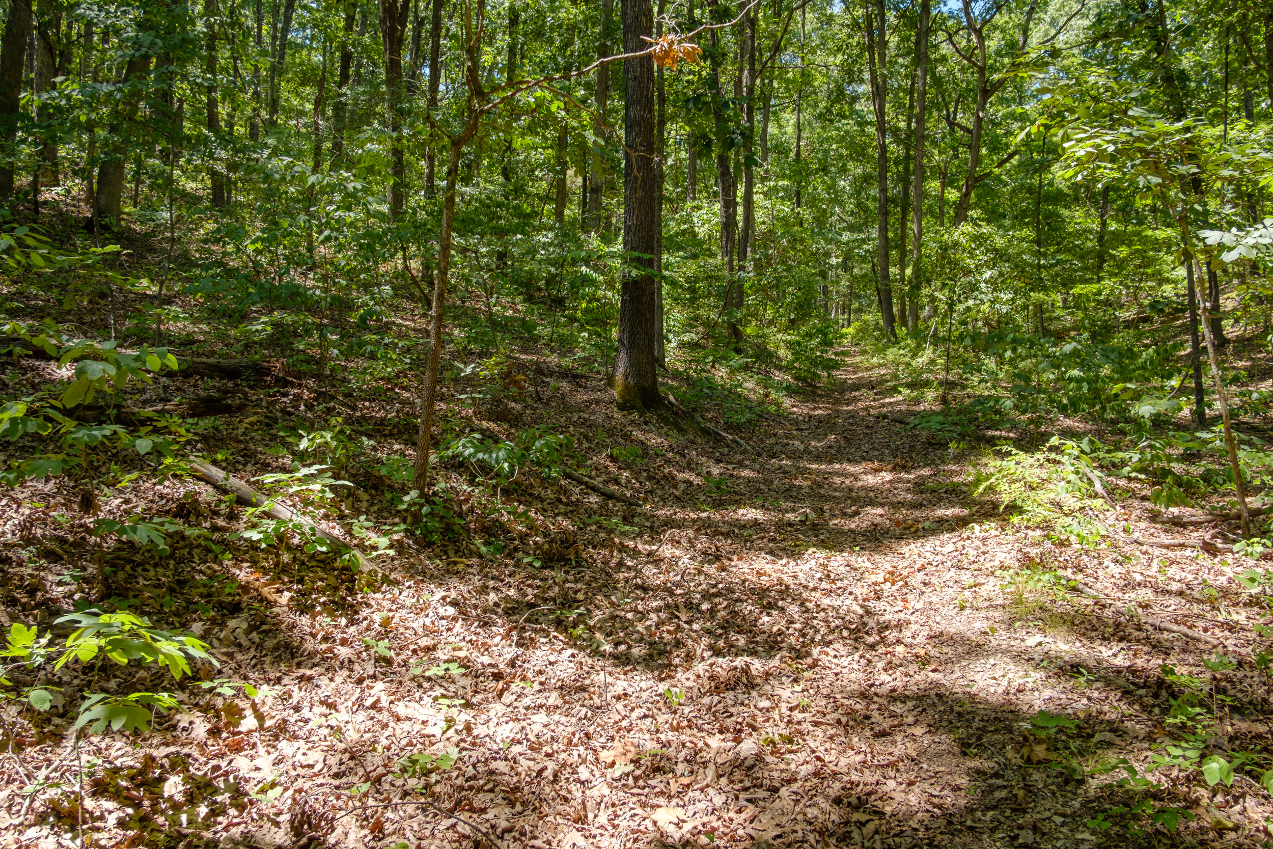 I took the Lake Trail from the northern end of the parking lot. It’s a good workout to start a hike with. It drops into two hollows which, of course, have to be climbed out of. At my usual pace (Just over a mile an hour) it took me an hour to get to the point where the Lake Trail sets off down the ridge to Piney Creek. I don’t like descending that trail (to be honest I don’t like climbing it either). It’s steep and the trail is covered in loose gravel, an accident waiting to happen. I almost always opt to take the ‘non-system’, ‘Farm Track Trail’. We’ve called it that because the trail follows the route of an old farm access track. Many years ago tomatoes were grown in the open floodplain at what is now the mouth of Piney Creek. There used to be gate posts visible at one point on this trail, but on my last couple of visits, I’ve not spotted them.