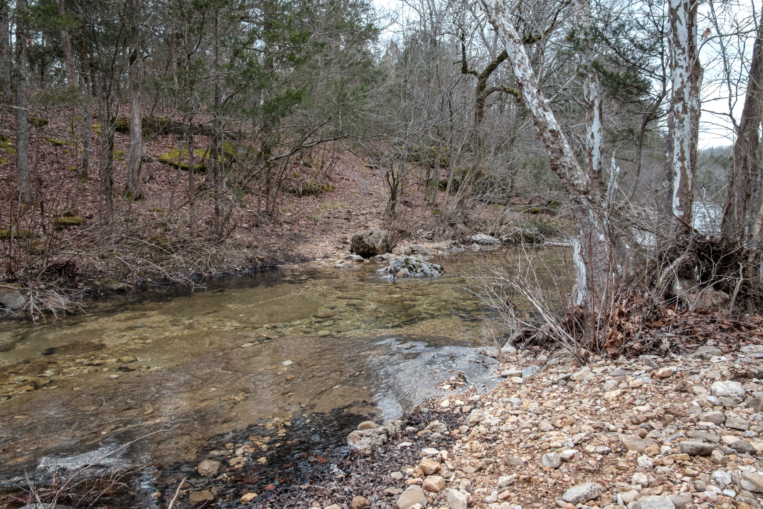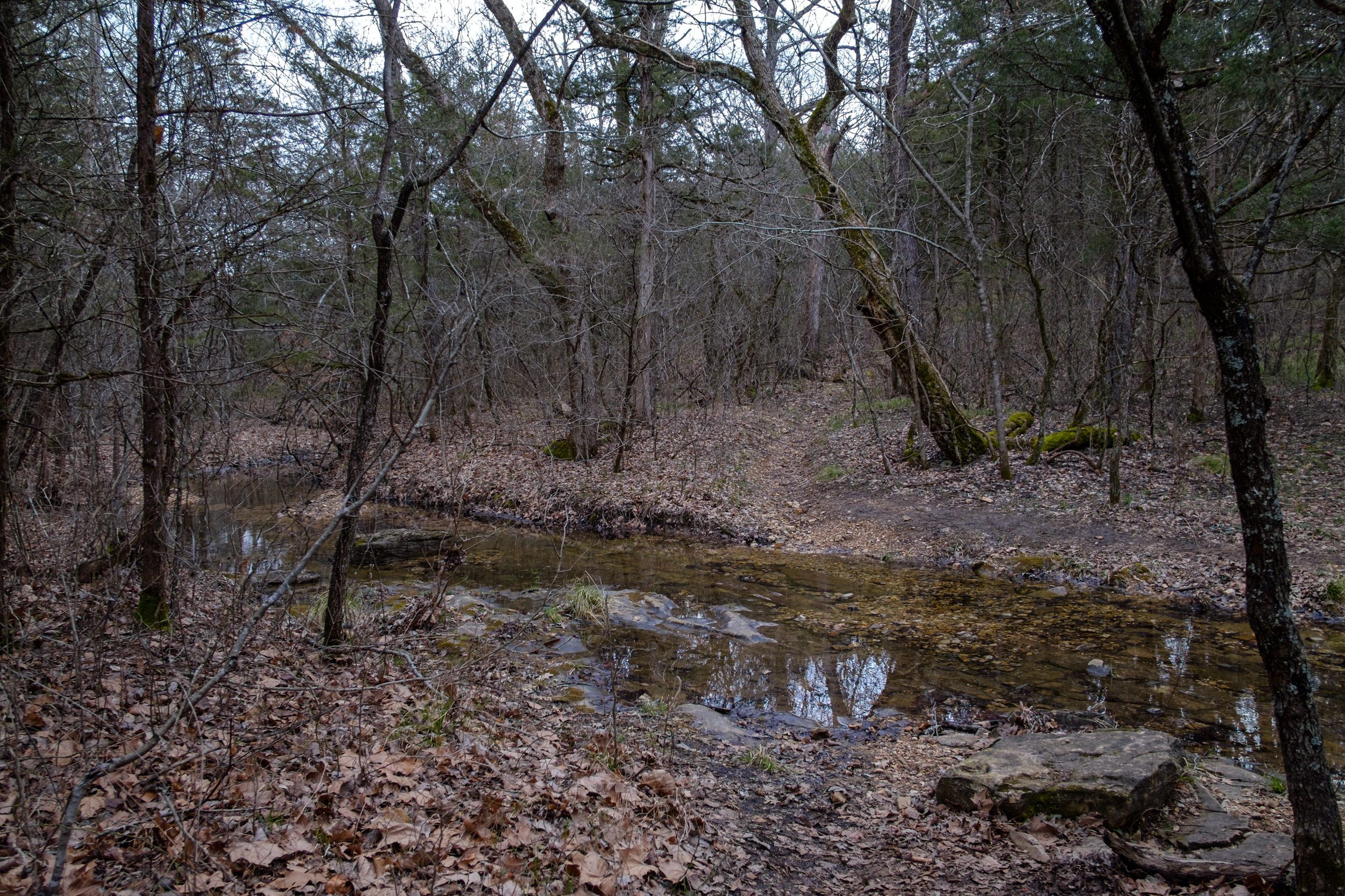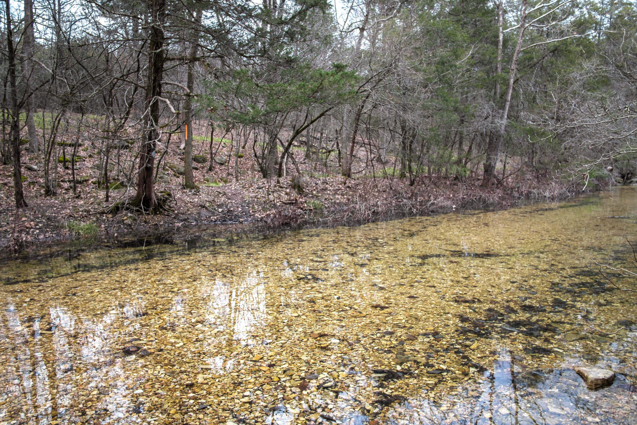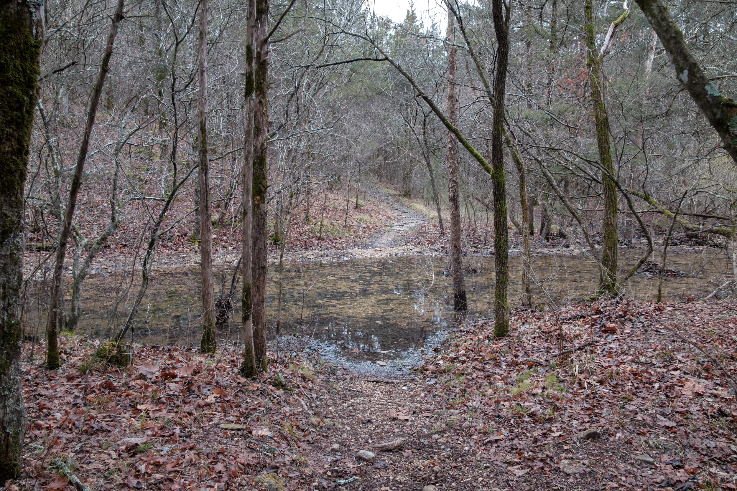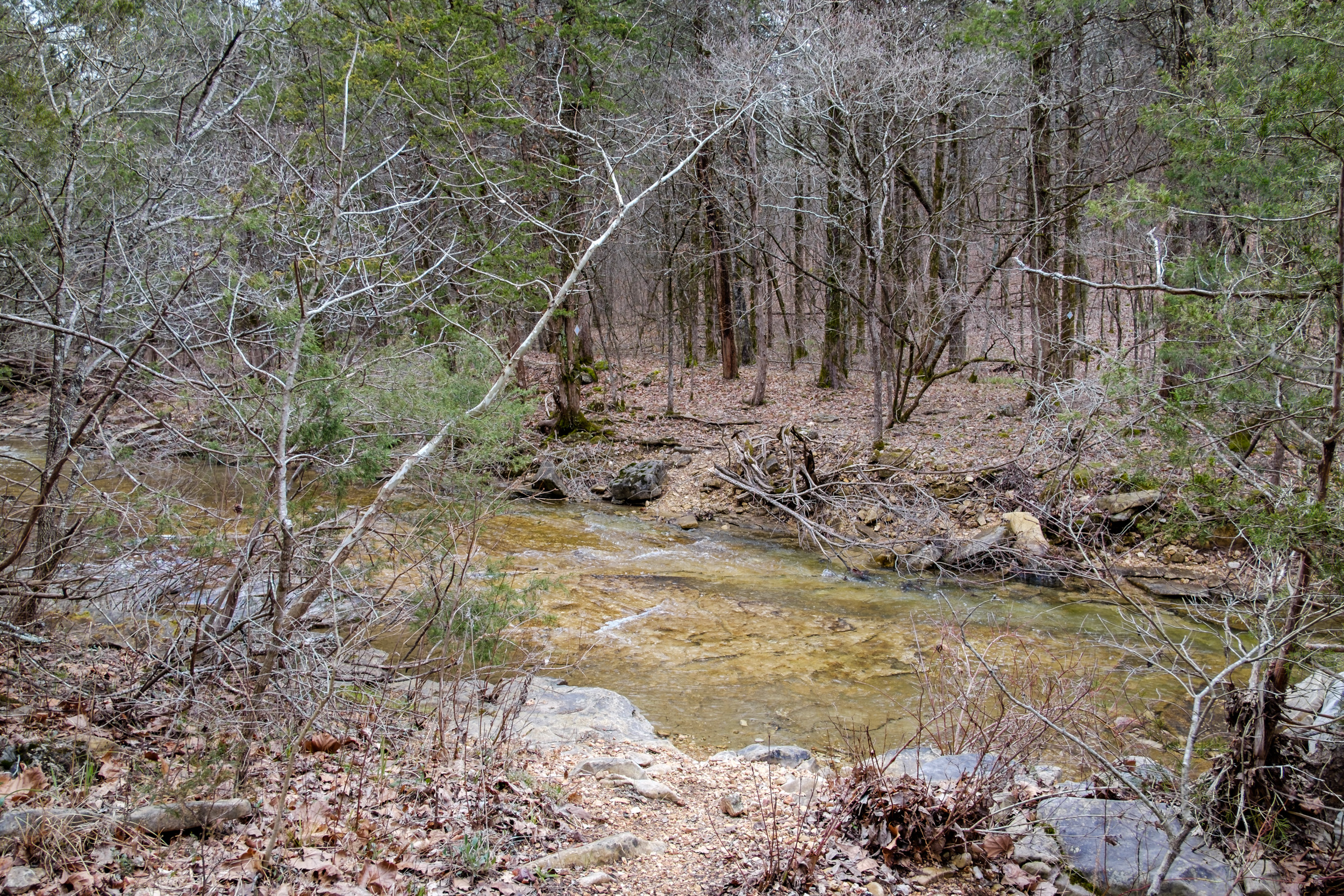 The day’s hike started with crossing the creek in Devil’s Den. I had decided I’d take a picture of all the creek crossings for the day — there was going to be a lot (eight, ten if you counted the crossings I did twice getting to and from The Falls). As it happened Devil’s Den was the deepest crossing, with the water up to my knees at one point.
