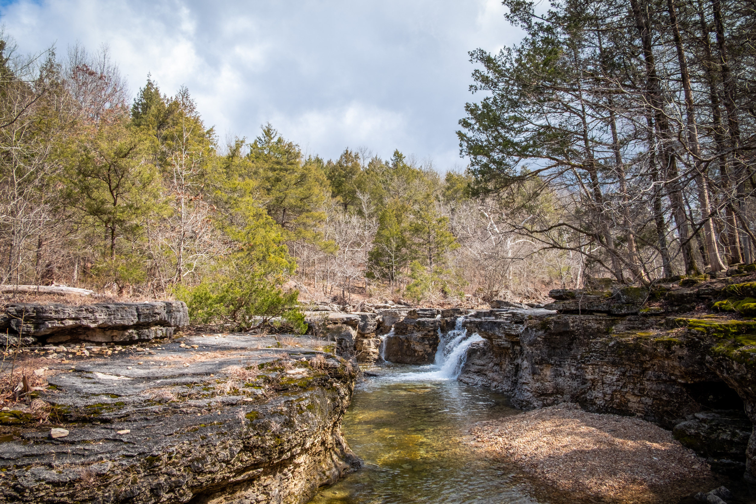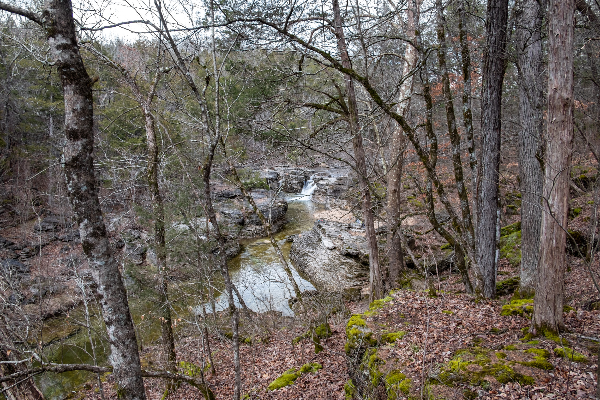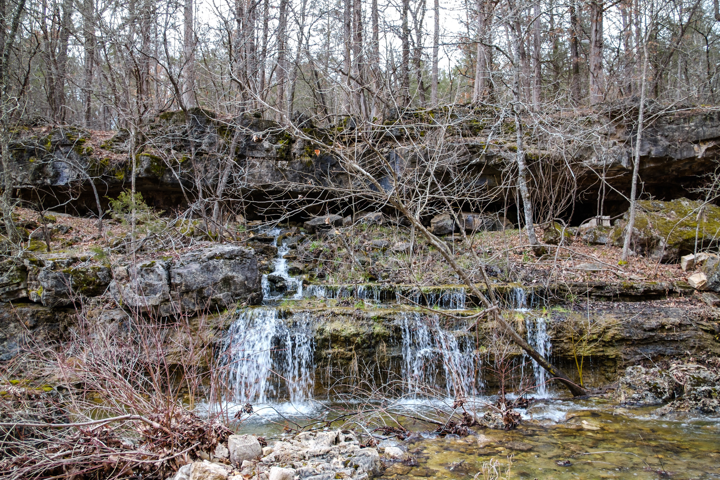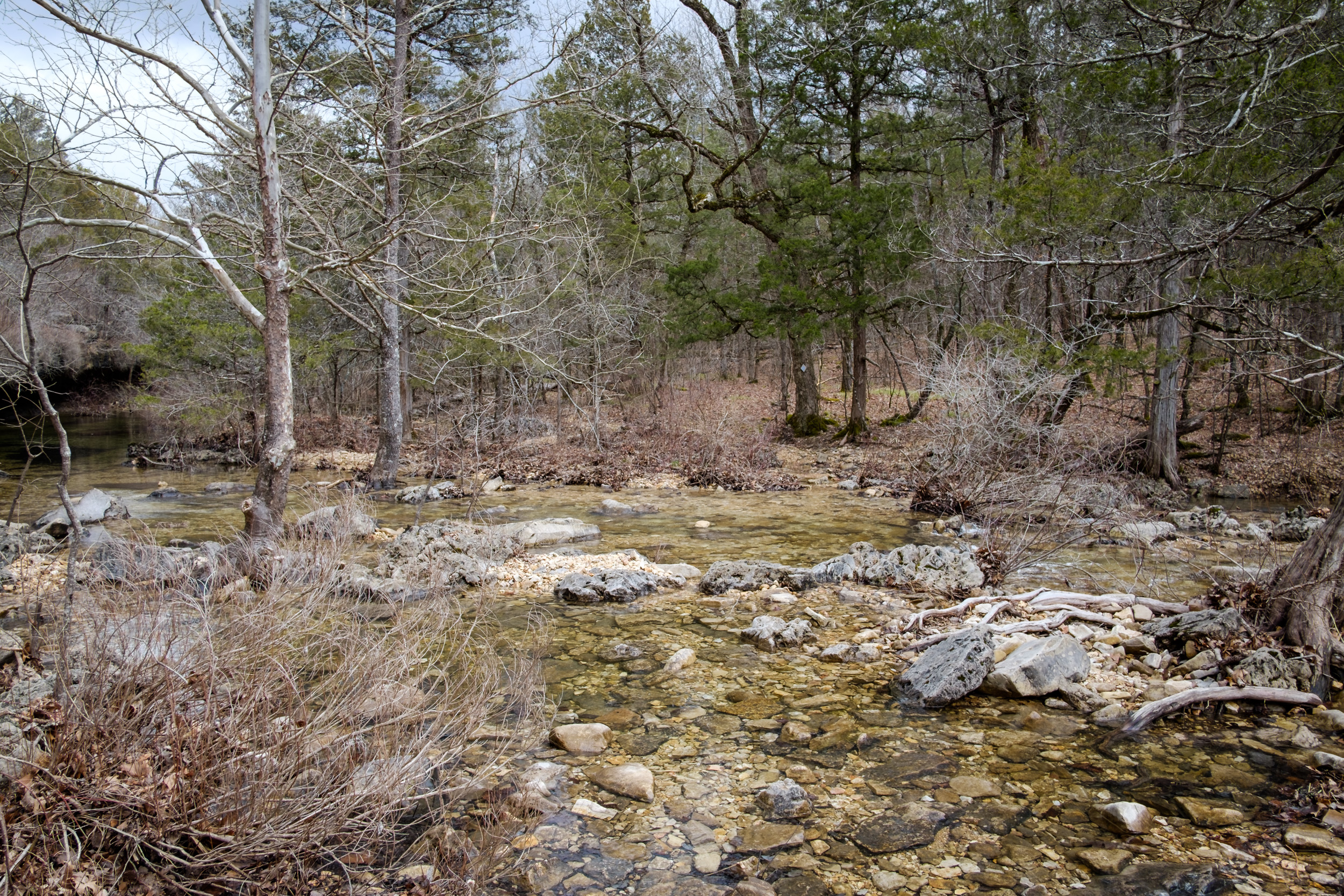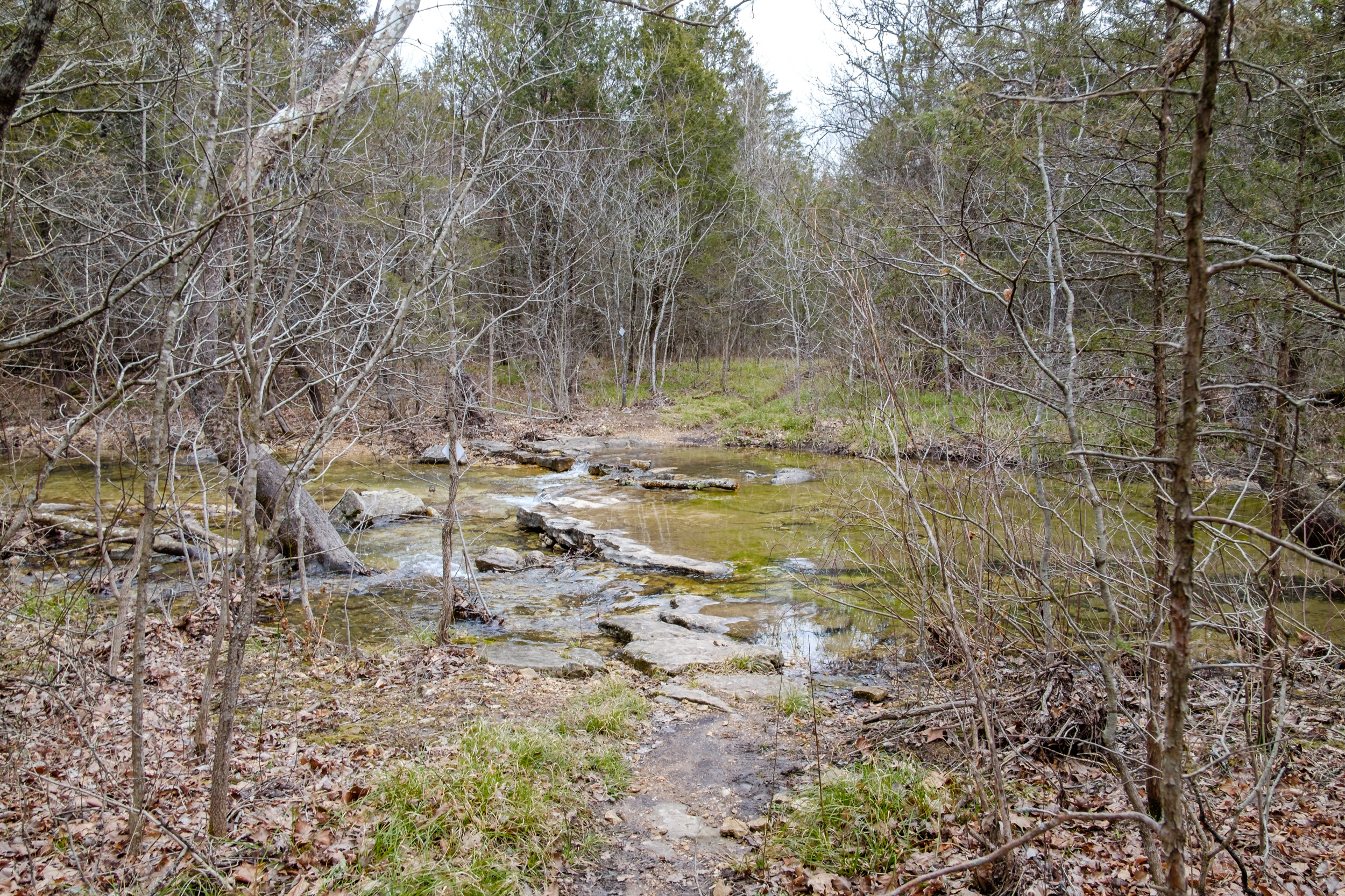 The day’s hike started with crossing the creek in Devil’s Den. I had decided I’d take a picture of all the creek crossings for the day — there was going to be a lot (eight, ten if you counted the crossings I did twice getting to and from The Falls). As it happened Devil’s Den was the deepest crossing, with the water up to my knees at one point.