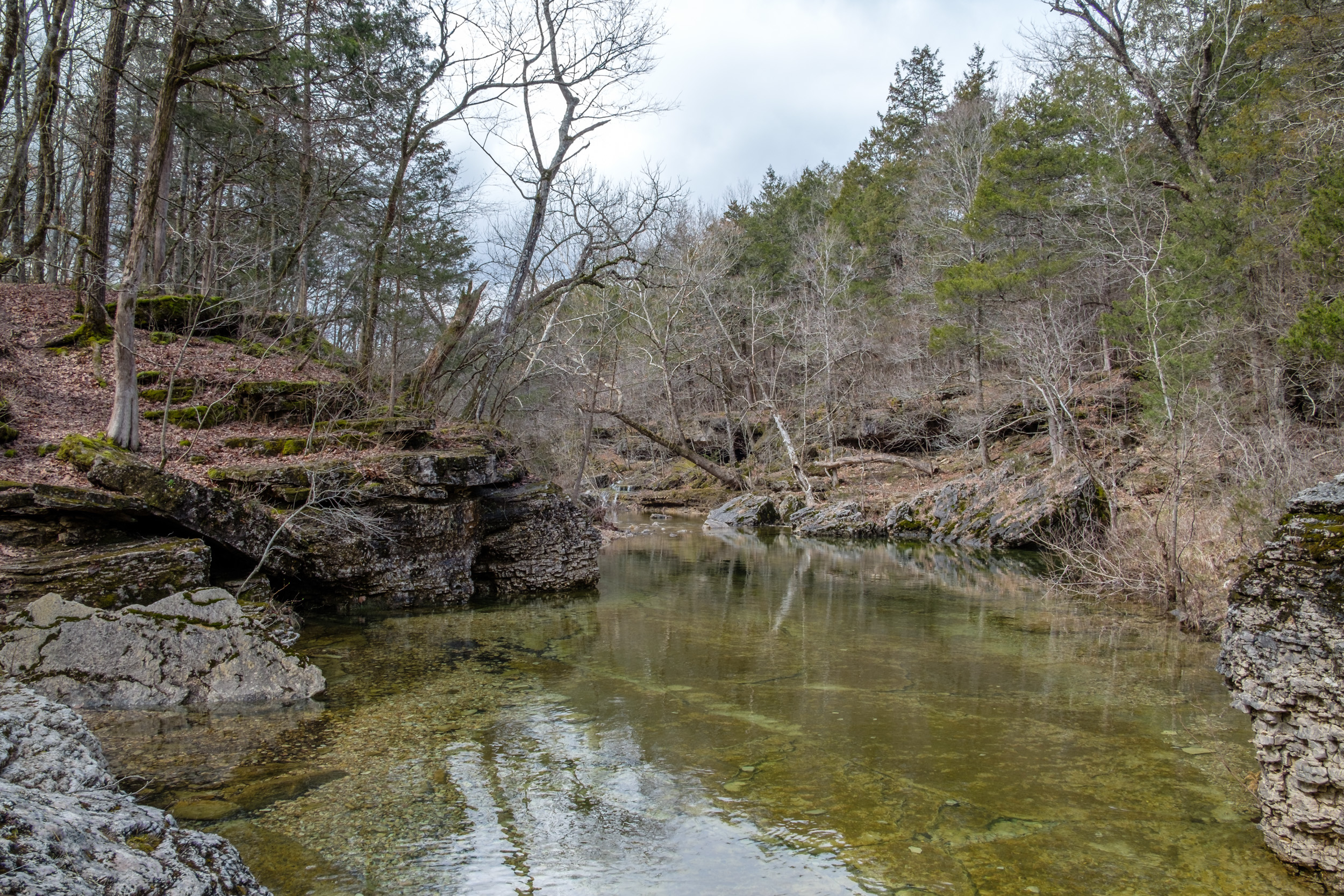 My original plan was to get some sunset pictures from the bluffs overlooking Beaver creek at Hercules Glades. There’s not a lot of water down that part of the trail — except for a very tannin rich stock pond — so I’d need to carry enough water for a couple of days.