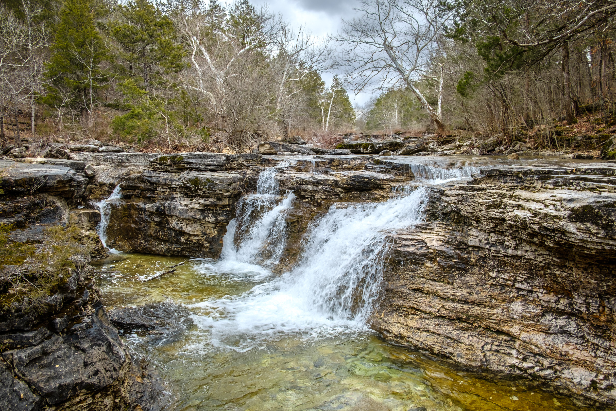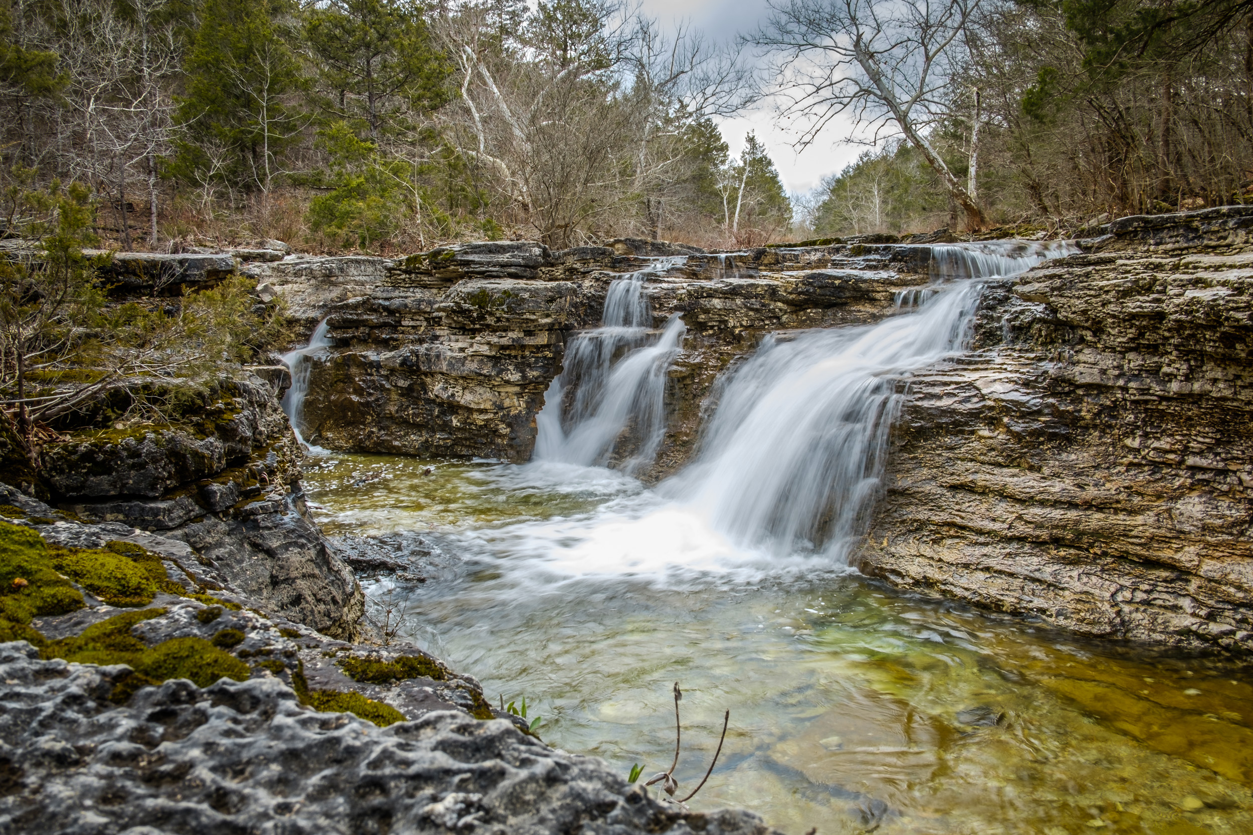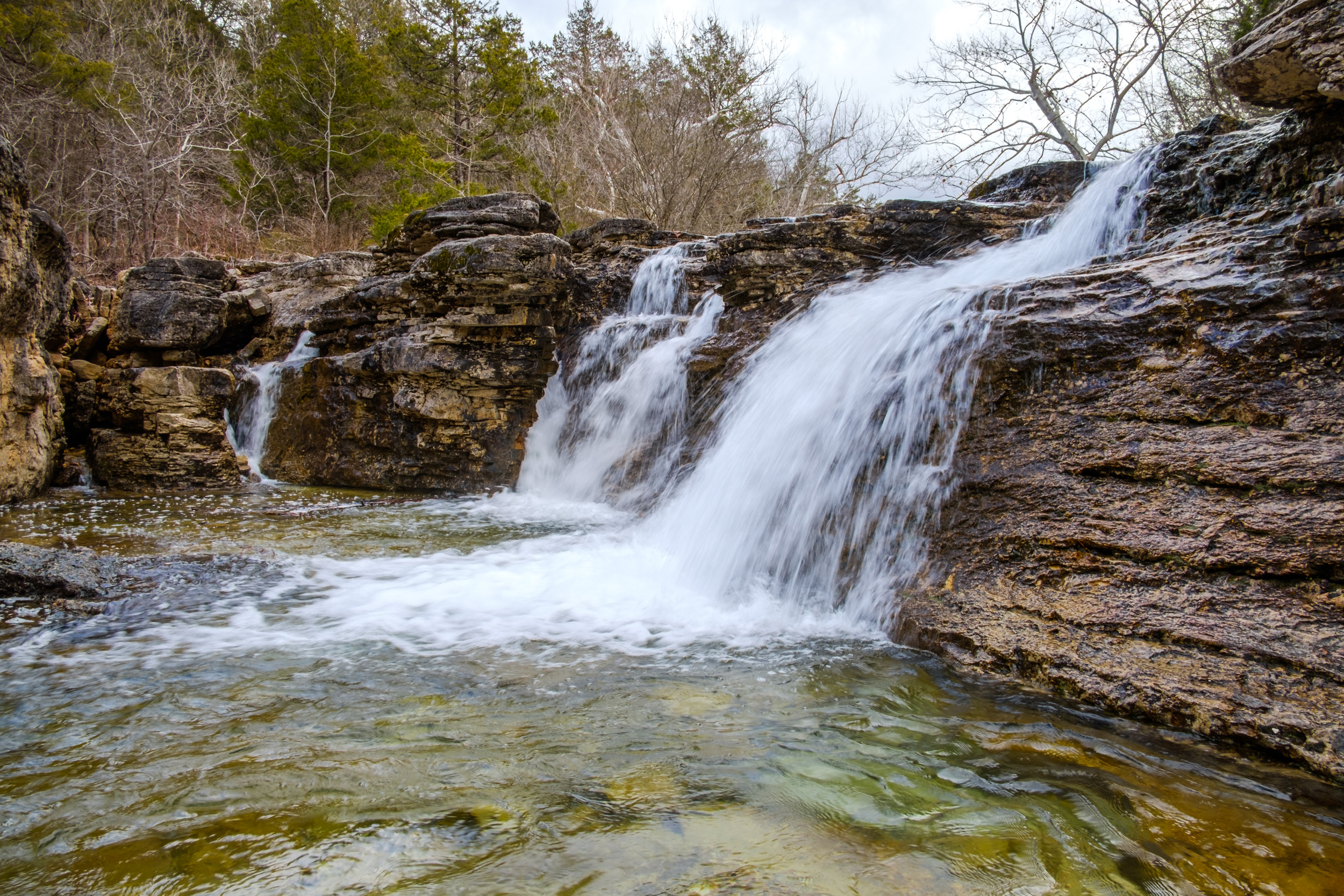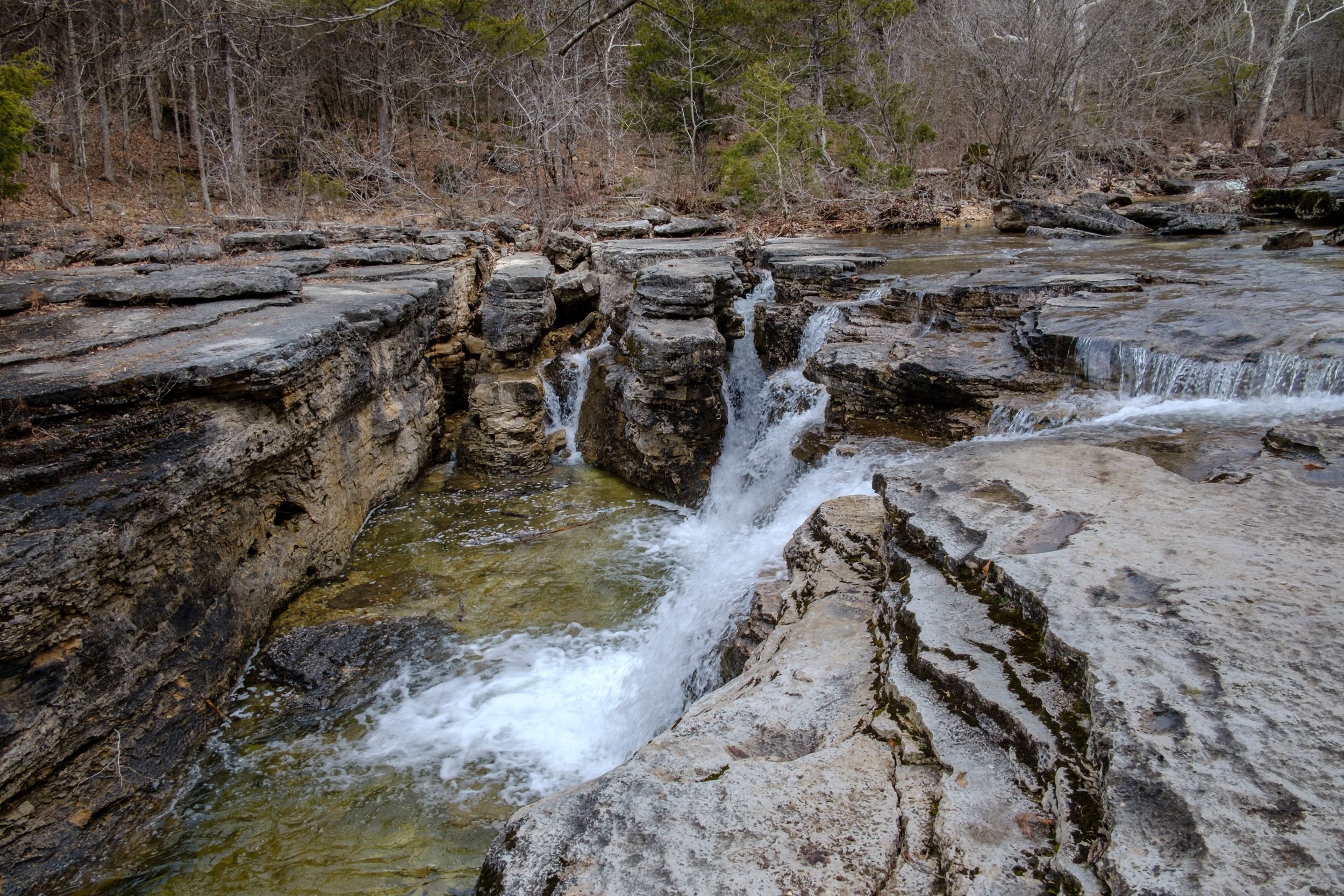 Any waterfall (let alone twin falls), in the middle of the wilderness are asking to be used as a natural shower. It’s one of those ‘I dare you’ things. I stopped and asked myself if in the years to come I’d regret not taking the time to give it a go. The answer was of course ‘yes’. I stripped off and very cautiously stepped under the falls. By golly it was cold. Standing under the falls for a few seconds was enough to satisfy my whim. This isn’t the first time I’ve showered in the wilderness. I took a shower under Missouri’s tallest waterfall, Mina Sauk Falls, in March 2012. By any reckoning I was well overdue another.