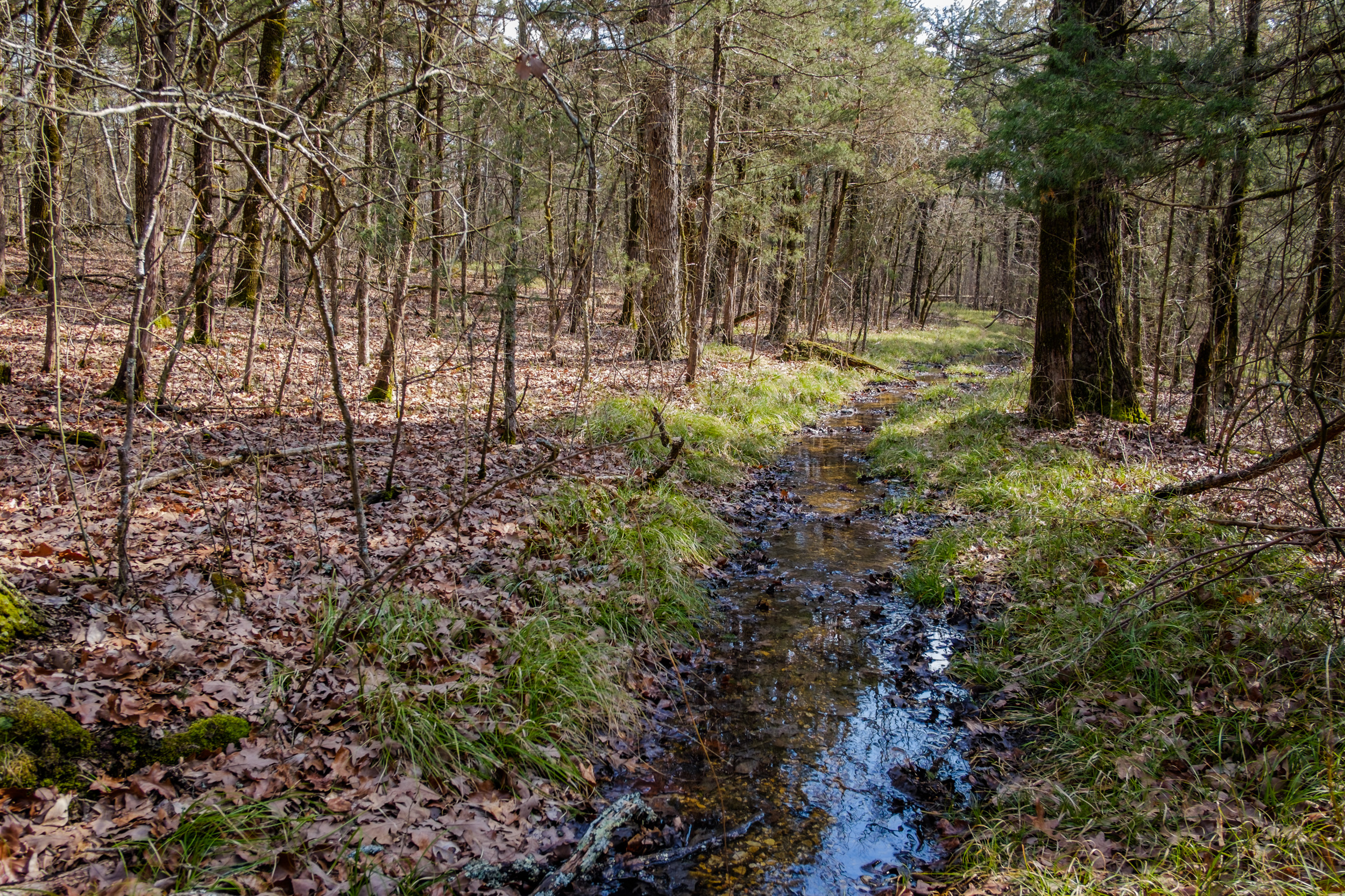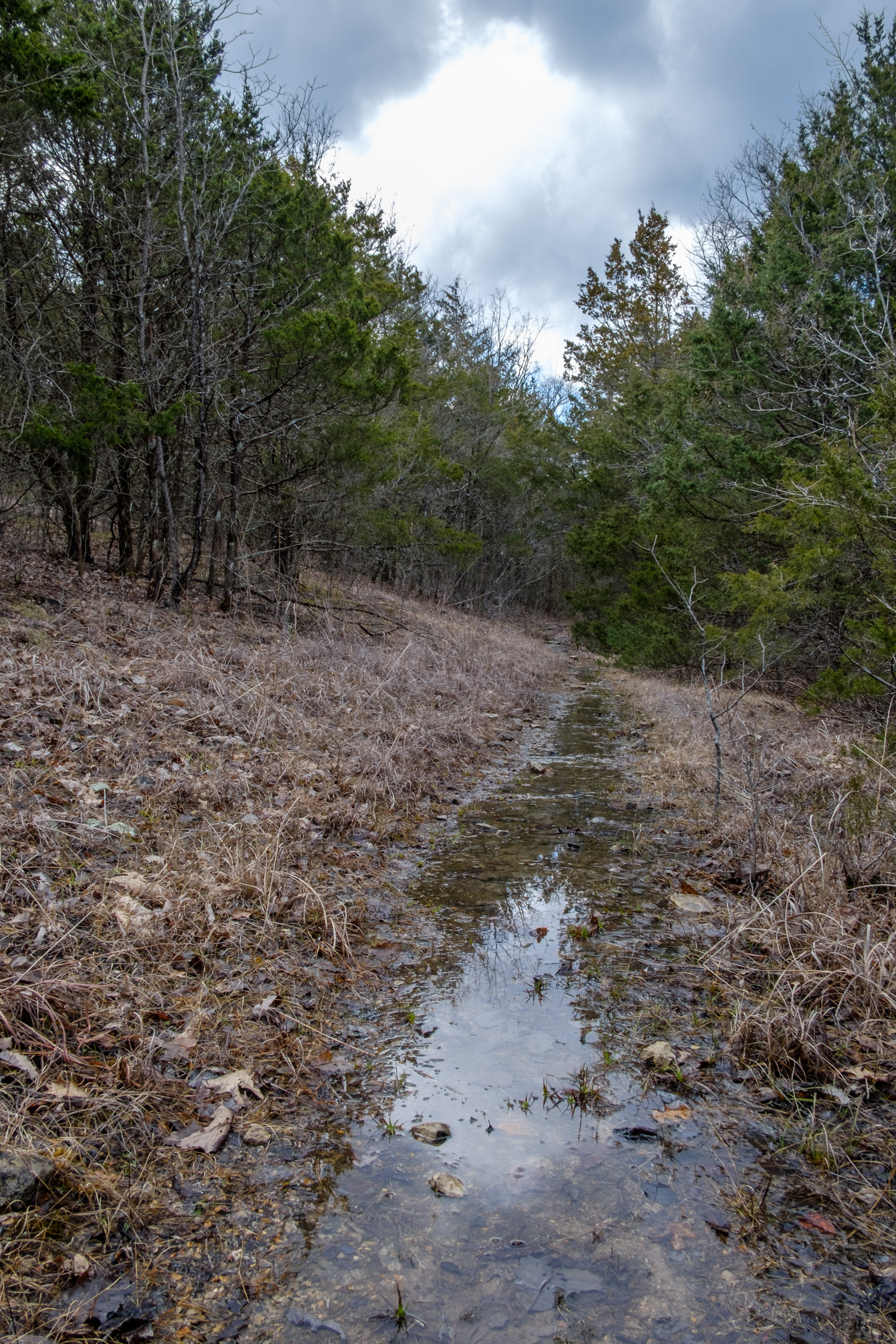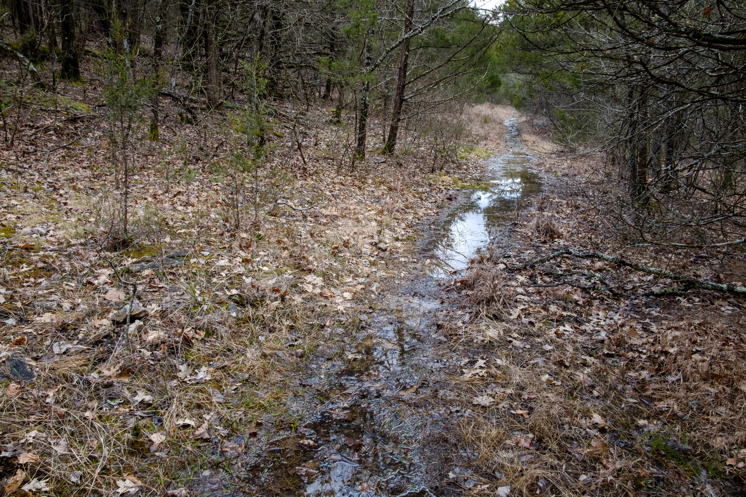 By three-forty I’d reached the Devil’s Den (Lower Pilot) Trail, and it was time to start the descent down to Long Creek and my campsite for the night. I toyed briefly with the idea of carrying on west to the bluffs, but I decided to stick with the plan. It still wasn’t raining, but the clouds were darkening. As I crossed the glades the temperature reached 85°F in the sun. The trail was a shallow running creek down near the stock pond that’s just beside this trail. It was also pretty noisy at the stock pond as the Spring Peepers were out and making a lot of noise. So much so that I recorded them.